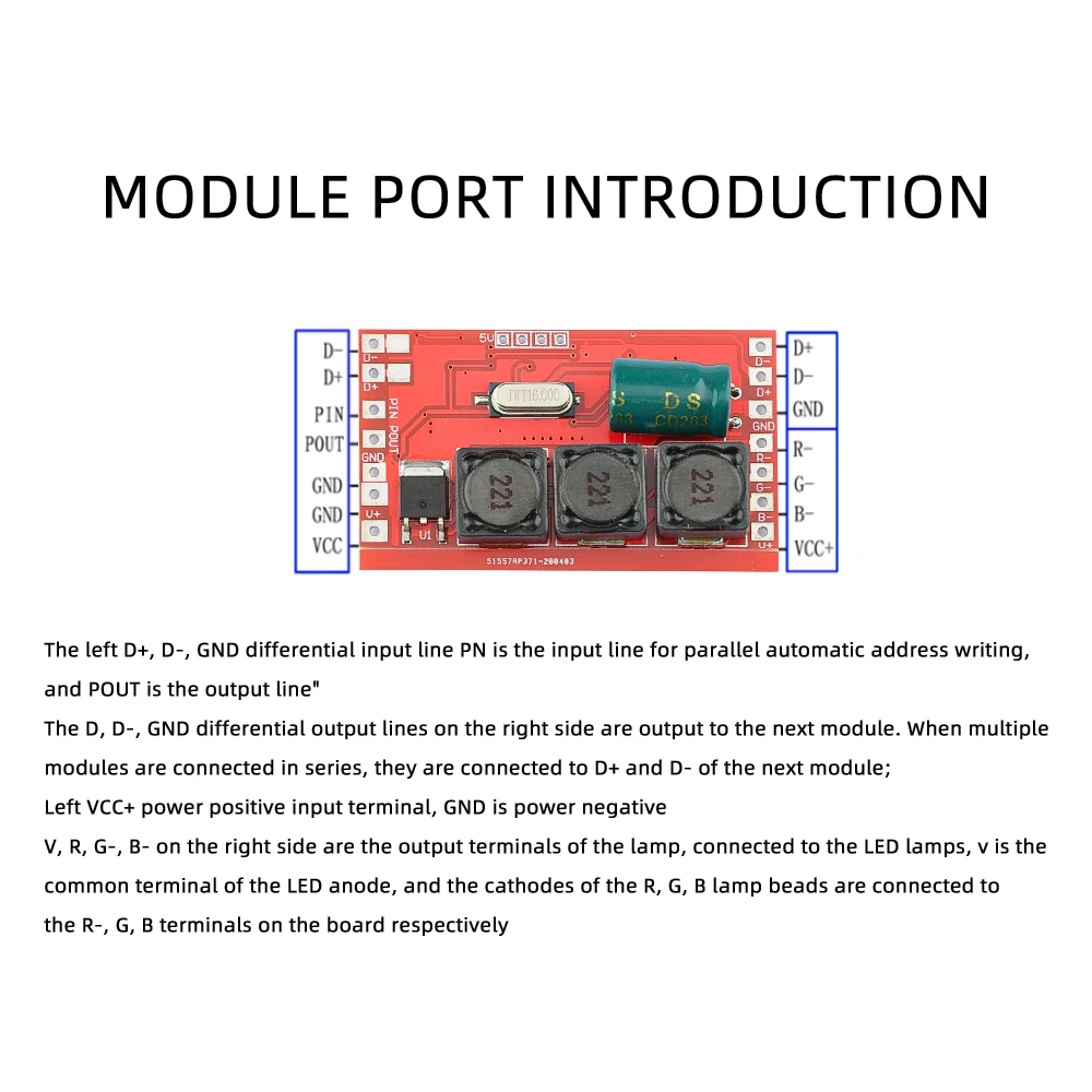 Каждый модуль соединен в серии, нет необходимости устанавливать адрес, адрес автоматически присваивается последовательно, очень удобно использовать, расстояние сигнала между драйверами может достигать 100 метров, И 170 платы драйвера могут быть подключены