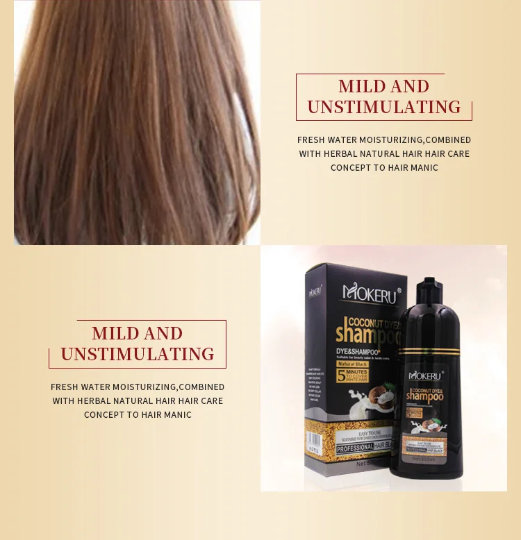 Мокеру кокосовое масло волос черный краситель шампунь-это вид шампуня, который может покрасить волосы в черный в течение 5-25 минут и специально разработан, чтобы сделать ваши волосы черными блестящими только через обычный процесс стирки волосы в ванной.КокосМасляная черная краска для волос шампунь также питает, защищает и восстанавливает кожу головы. По сравнению с традиционной краской для волос, она имеет преимущество низкой стоимости, экономит время.