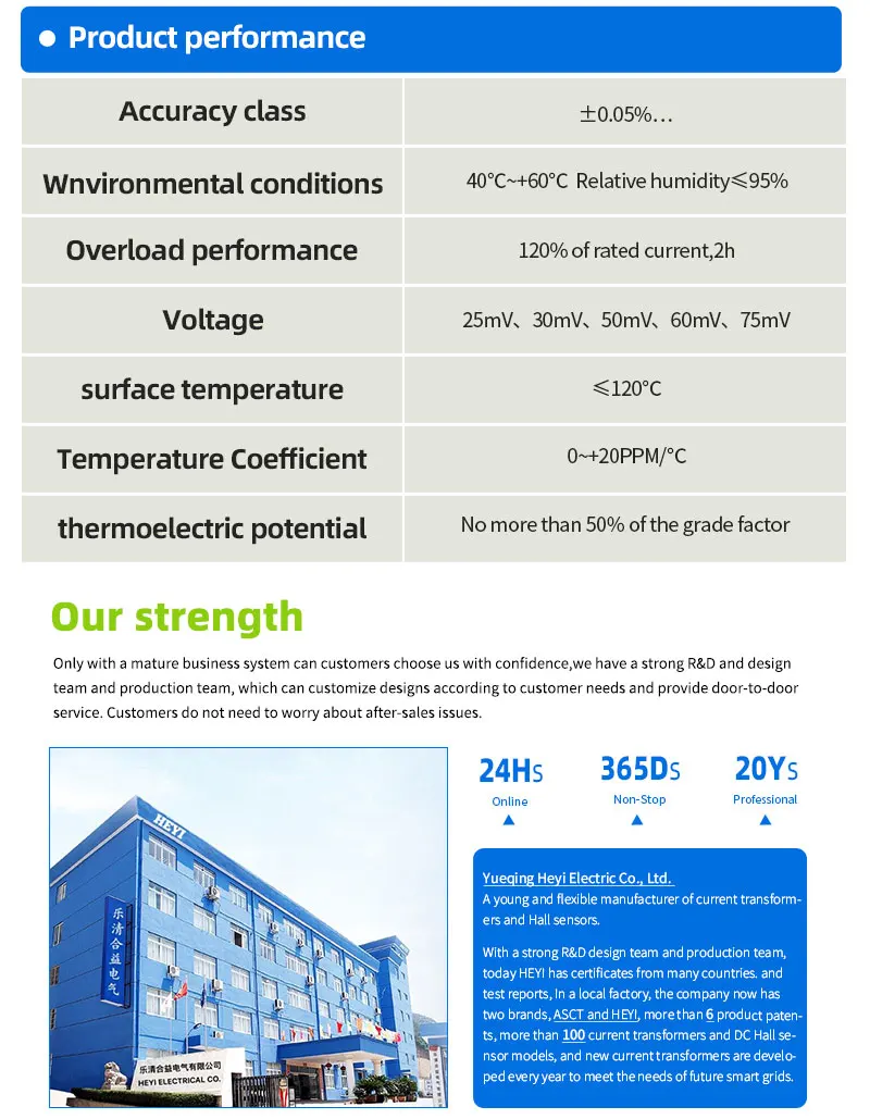 Yueqing Heyi Electric Co., Ltd.-молодой и гибкий Производитель Трансформаторов тока и датчиков Холла постоянного тока. HEYI-семейная компания. Главный инженер, директор по продажам и менеджер по производству-все члены нашей семьи. HEYI из небольшой семьи с годами тяжелой работы, компания стала поставщиком OEM и ODM для Siemens, Schneider, Fuji Electric, Softbank, LG, Samsung и других компаний. Благодаря сильной R & D и проектной команде и производственной команде, сегодня Heyi имеет сертификаты из нескольких стран. И отчеты об испытаниях, мы экспортируем в США, Канаду, Великобританию, Францию, Германию, Италию, Испанию, Бразилию и другие страны, И заключили соглашения о покупке с силовыми бюро в Европе и Юго-Восточной Азии. Кроме того, HEYI доступен в Египте и Индонезии. Местный завод, компания в настоящее время имеет два бренда ASCT и HEYI, более 6 патентов на продукцию, более 100 типов трансформаторов тока и моделей датчиков Холла постоянного тока, что дает клиентам больше выбора, И будет разрабатывать новые трансформаторы тока каждый год для удовлетворения потребностей будущих умных сетей, Покупатели трансформаторов тока и датчиков Холла постоянного тока из разных стран могут установить долгосрочное сотрудничество с Heyi. Мы можем настроить и разработать дизайн в соответствии с потребностями клиента, а также обеспечить обслуживание от двери до двери, клиентам не нужно беспокоиться о проблемах после продажи.