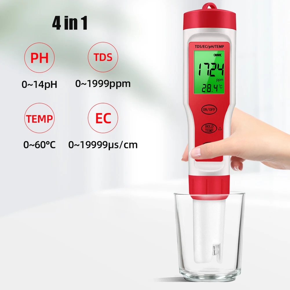 Этот 4 в 1 тестер качества воды может измерять PH, общее количество растворенных твердых веществ, EC и температуру для вас. Этот тестер поможет вам полностью понять качество воды в испытанной воде, чтобы вы могли пить или использовать более легко. Если вы заинтересованы в этом продукте, приходите и попробуйте, это не подведет вас.