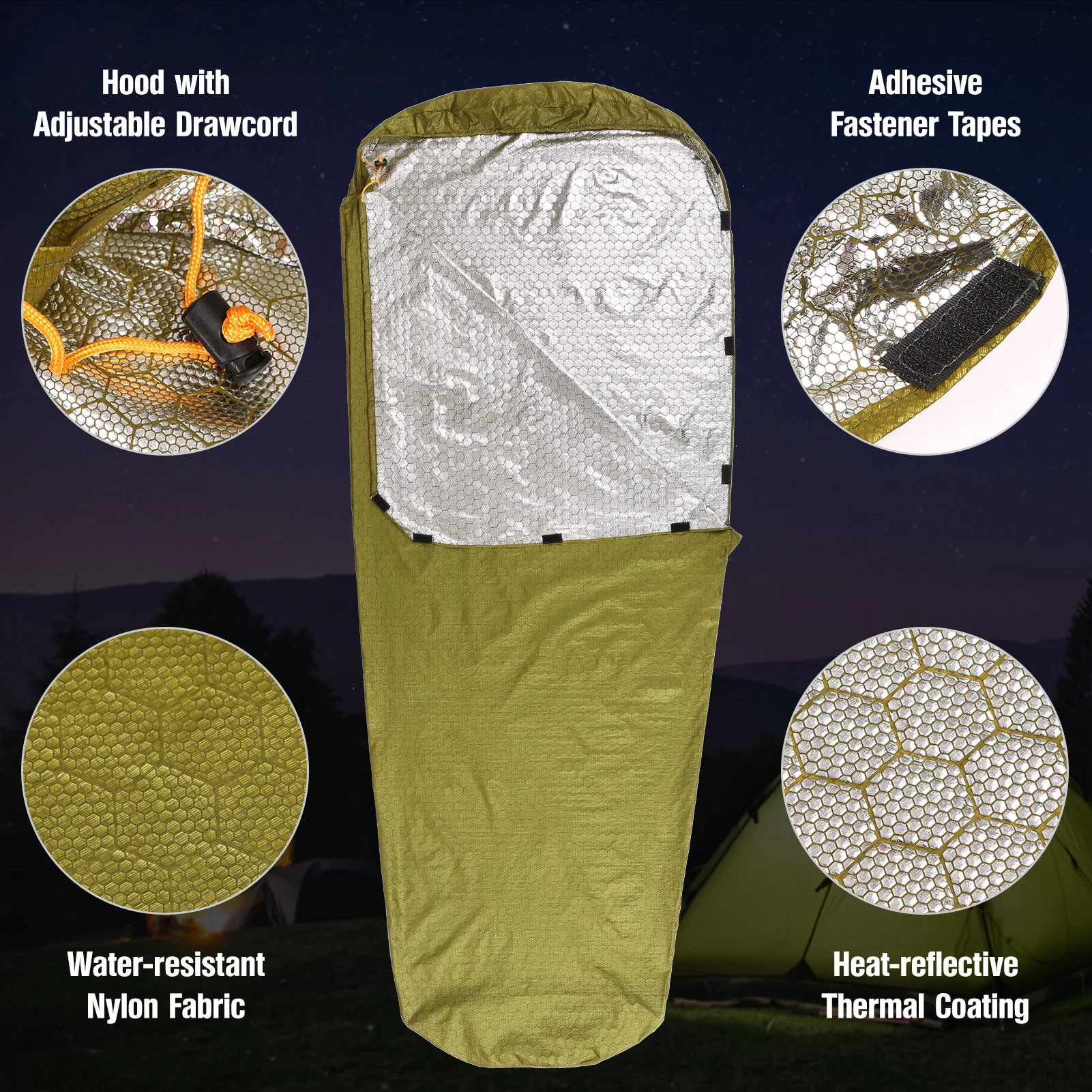 Этот аварийный спальный мешок изготовлен из водонепроницаемой нейлоновой ткани и теплоотражающего алюминиевого внутреннего покрытия, чтобы держать вас в тепле при низкой температуре. Он легкий и может складываться в компактный размер для удобного хранения и переноски. Идеально подходит для кемпинга, пеших прогулок, альпинизма, приключений на открытом воздухе, выживания и т. д.