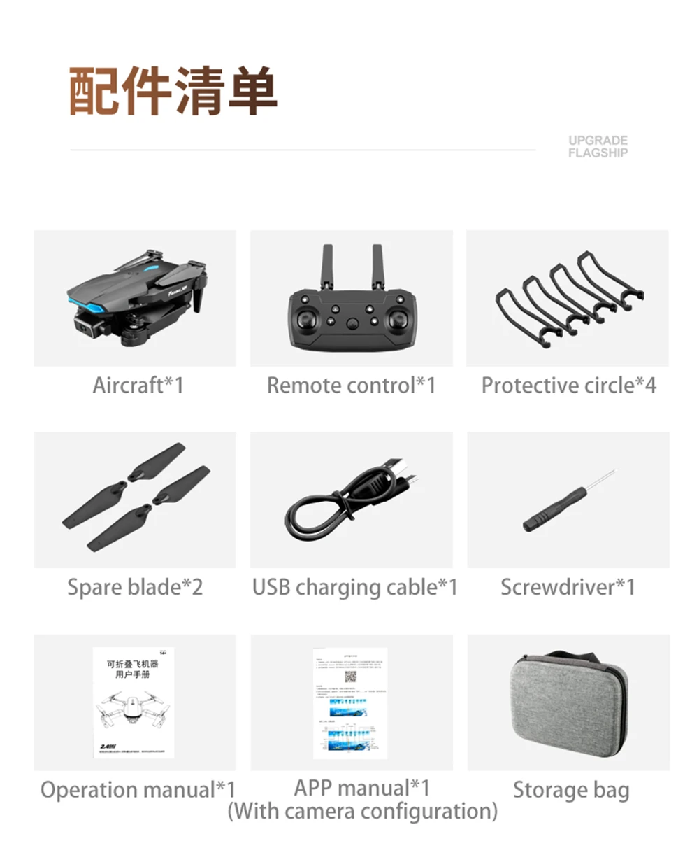 Функции: вверх/вниз, вперед/назад, влево/вправо, боковой полет, трехуровневая скорость полета, светодиодный свет, Безголовый режим, автоматическое возвращение одной кнопкой, режим удержания высоты, wiFi FPV, траектория полета, камера/видео