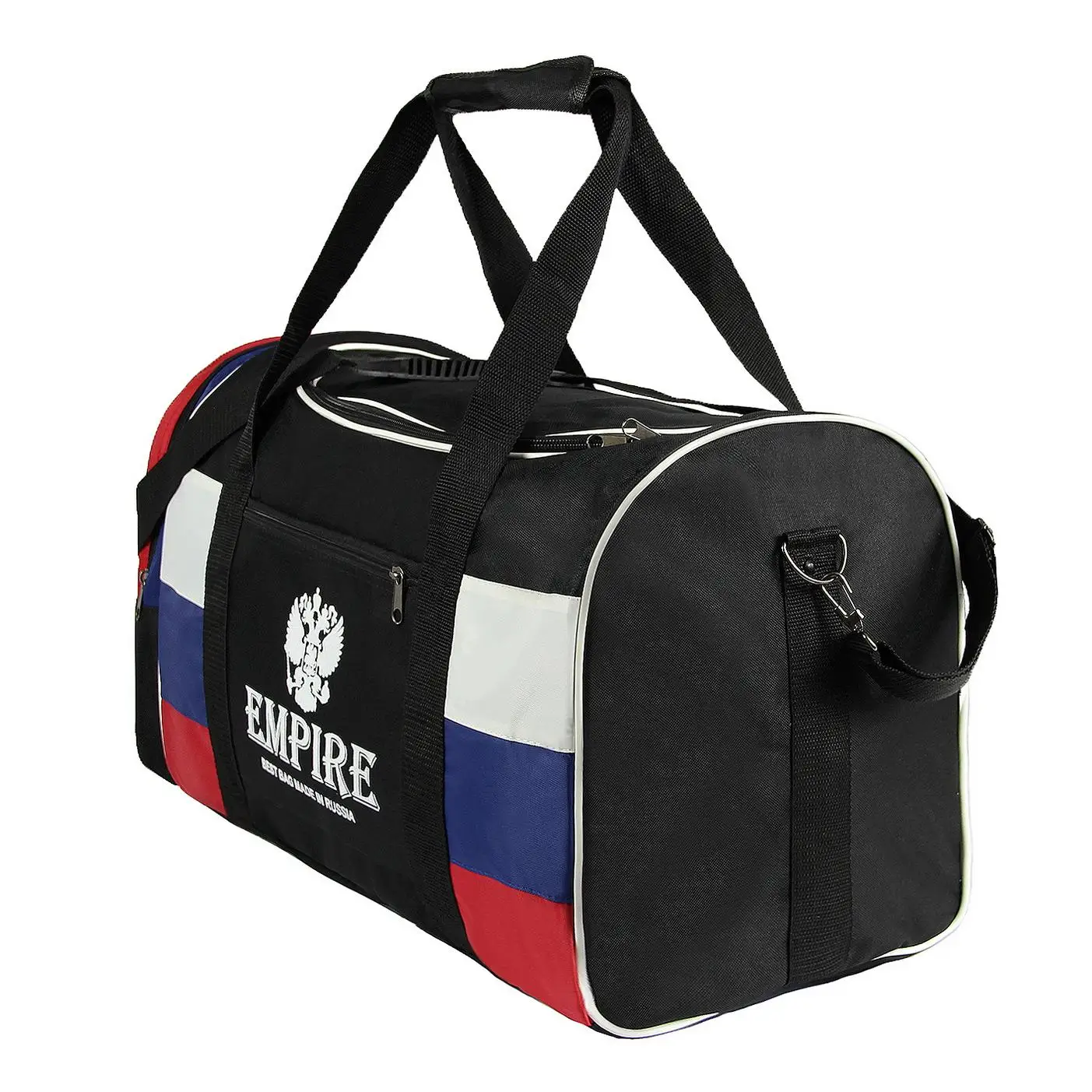 Дорожно-спортивная сумка средних размеров для транспортировки личных вещей и спортивного снаряжения. Изготовлена из прочной водоотталкивающей ткани. Имеется одно объёмное отделение, один боковой отдел, накладной карман на передней стенке. Фурнитура металлическая. Ручки укреплены строчкой "зигзаг". Комплектуется съёмным регулируемым ремнём.