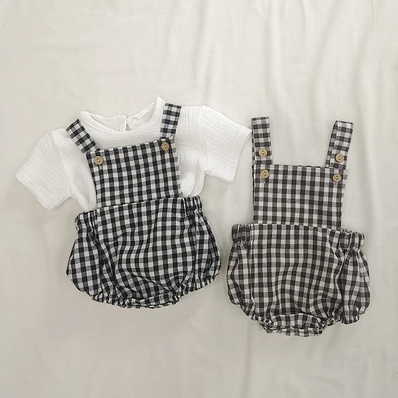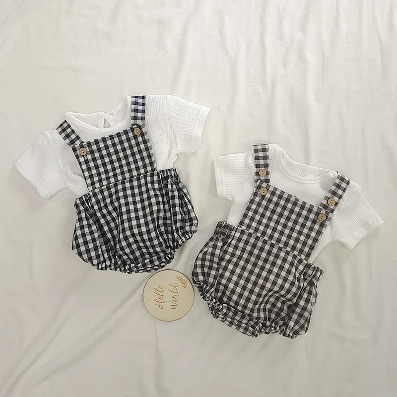 2 шт./компл., летняя одежда для малышей белая футболка для маленьких мальчиков и девочек + клетчатые штаны на бретелях комбинезон для малышей, Модный комбинезон, комплект одежды