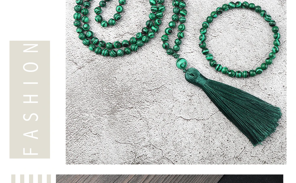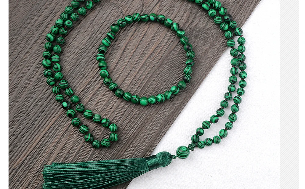 Модное зеленое малахитовое ожерелье 108 Mala, украшенное бусинами, для женщин, с узелками, кисточками, 6 мм, камень, тянущиеся браслеты, для мужчин, для йоги, молитвы, ювелирный набор