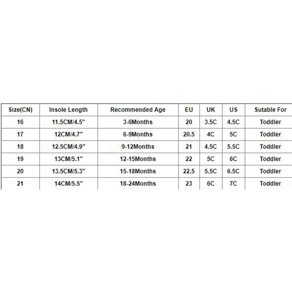 Размер (CN) Длина стельки Рекомендуемый возраст ЕС Великобритания США Sutable для 16 11,5 см/4,5" От 3 до 6 месяцев 20 3.5C 4.5C Для малышей 17 12 см/4,7" От 6 до 9 месяцев 20,5 4C 5C Для малышей 18 12,5 см/4,9" 9 to 12months 21 4.5C 5.5C Для малышей 19 13 см/5,1" 12-15Months 22 5C 6C Для малышей 20 13,5 см/5,3" 15-18Months 22,5 5.5C 6.5C Для малышей 21 14 см/5,5" 18-24Months 23 6C 7C Для малышей