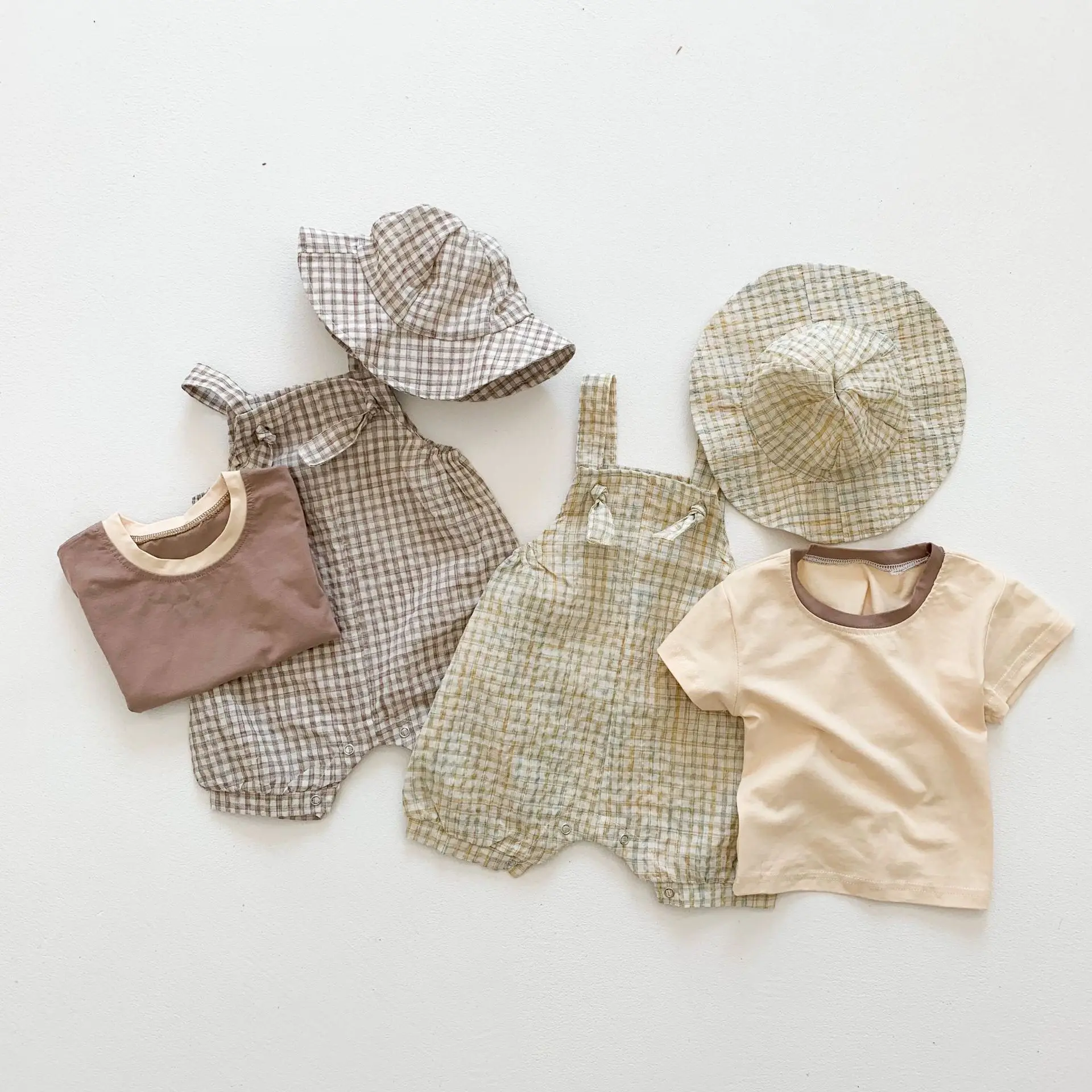 Костюмы для малышей Новинка 2022 года, шляпа + штаны + Футболка костюмы для мальчиков и девочек из трех предметов Милая летняя одежда в клетку для маленьких девочек, От 0 до 2 лет