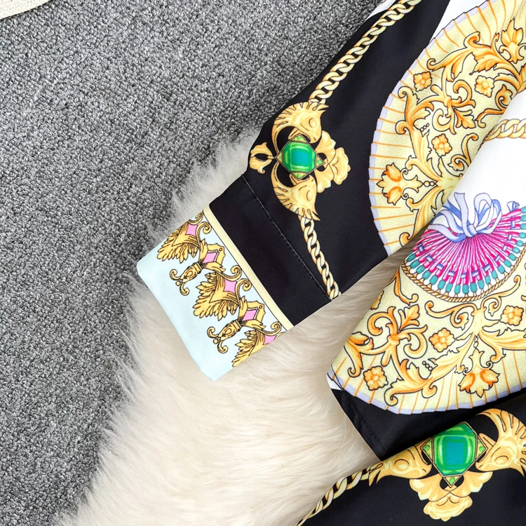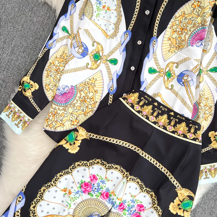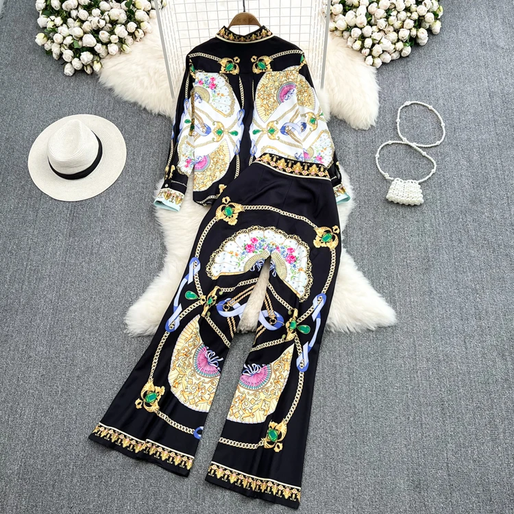 Женский комплект из двух предметов на лето и весну, блузка на пуговицах с объемным принтом, рубашка, топы + широкие брюки,