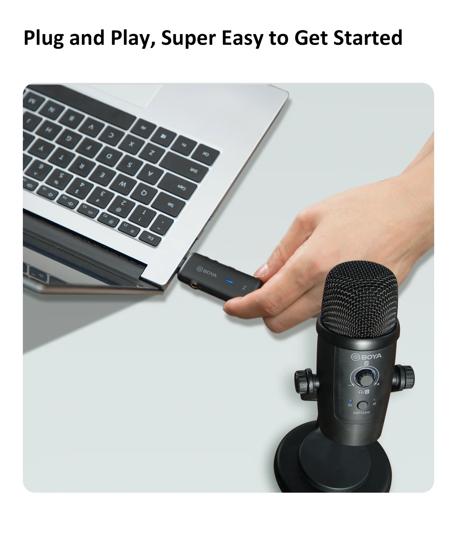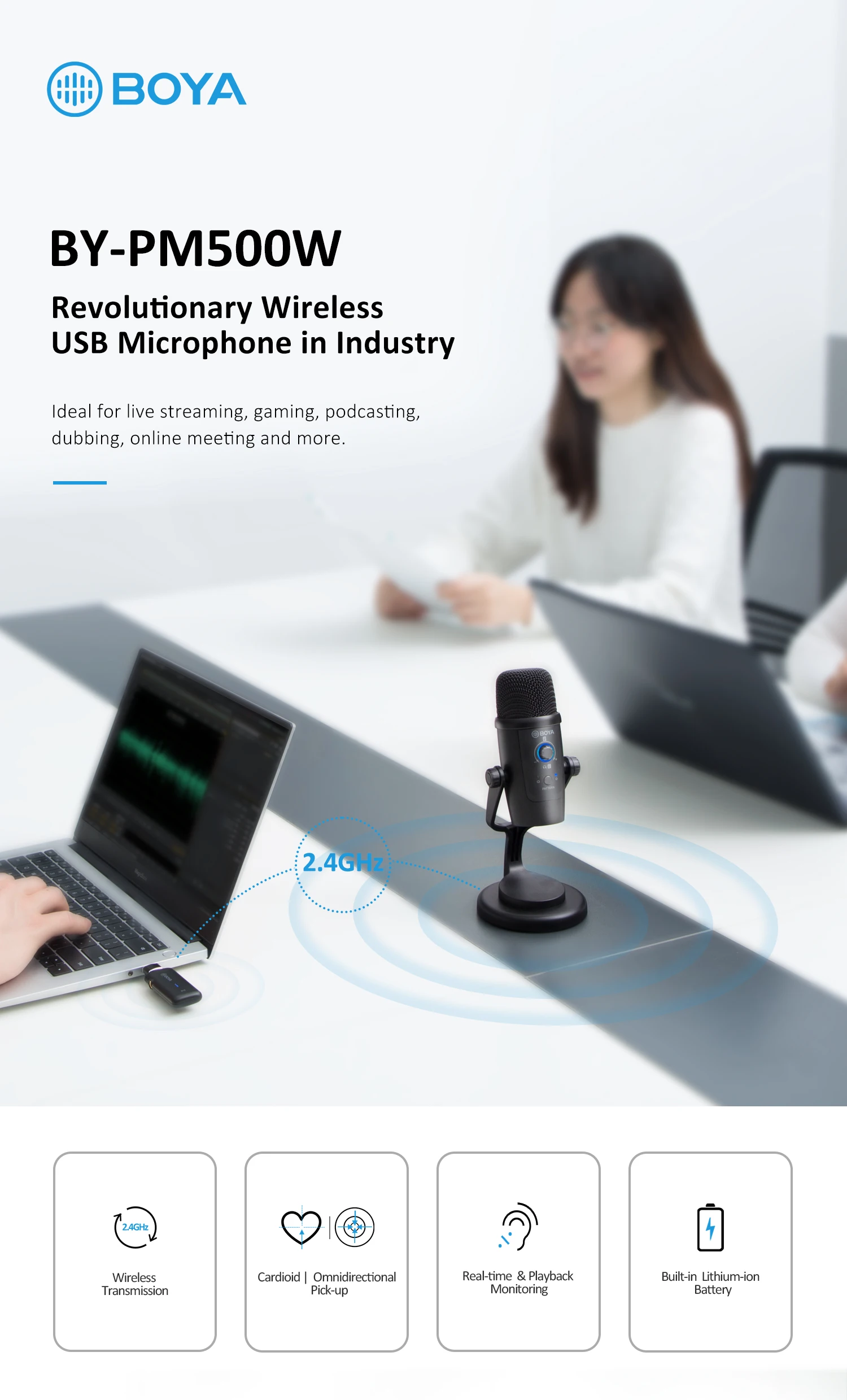 The BOYA BY-PM500W is a revolutionary wireless USB microphone in the industry, offering wired or wireless operation for gamers, streamers, podcasters in a variety of applications.