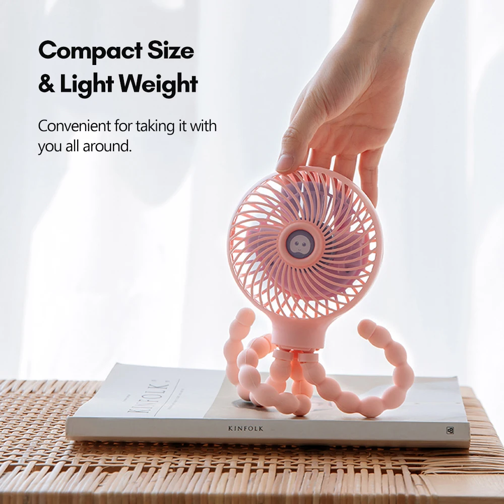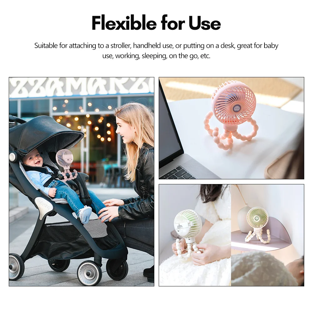 [Гибкий вентилятор осьминога]Изготовлено из высококачественного АБС-материала, Ножки штатива мягкие и легко сгибаются, легко крепятся к коляске, кроватке, велосипеду или беговой дорожке, также могут устойчиво стоять на столе, подходит для ручного использования.