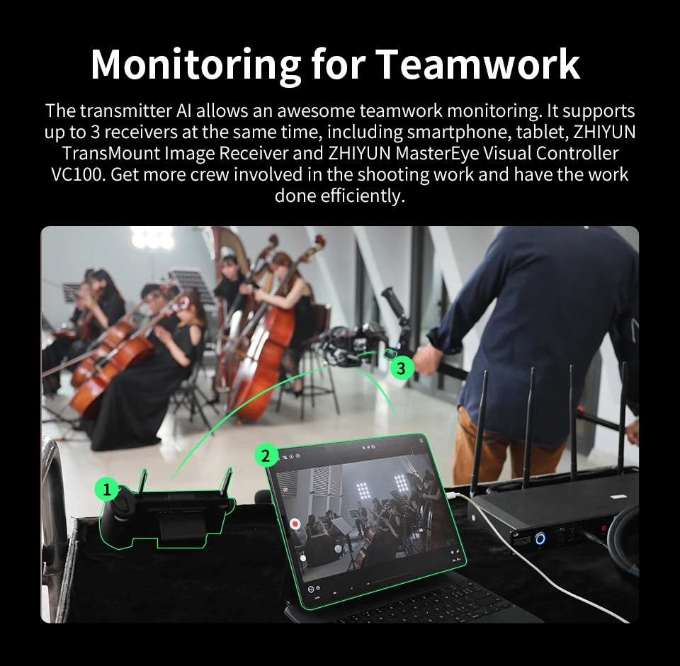 Доступно вместе с iPad и смартфоном. Новый мониторинг экрана. Видеооператор, режиссер и оператор фокусировки могут одновременно следить за кадрами и принимать участие в более эффективной командной работе.