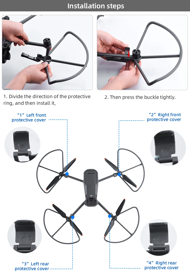 1. Полузакрытое защитное кольцо полностью закрывает лезвия, чтобы избежать травм или повреждений, вызванных попаданием посторонних предметов в лезвия, и повышает безопасность полета;