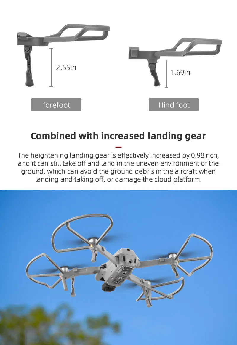 3. Увеличивающаяся посадочная Шестерня эффективно увеличивается на 2 см, и она может все еще снимать и приземляться в неровной среде земли, которые могут избежать заземления в самолете при посадке и взлете, или повредить облачную платформу,