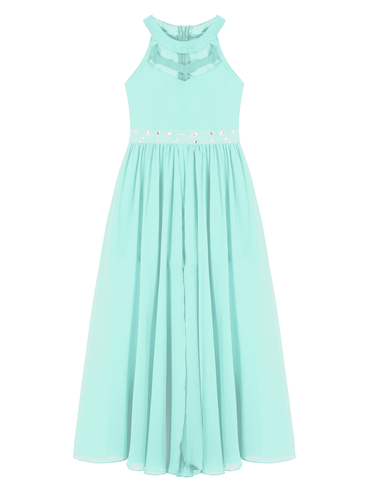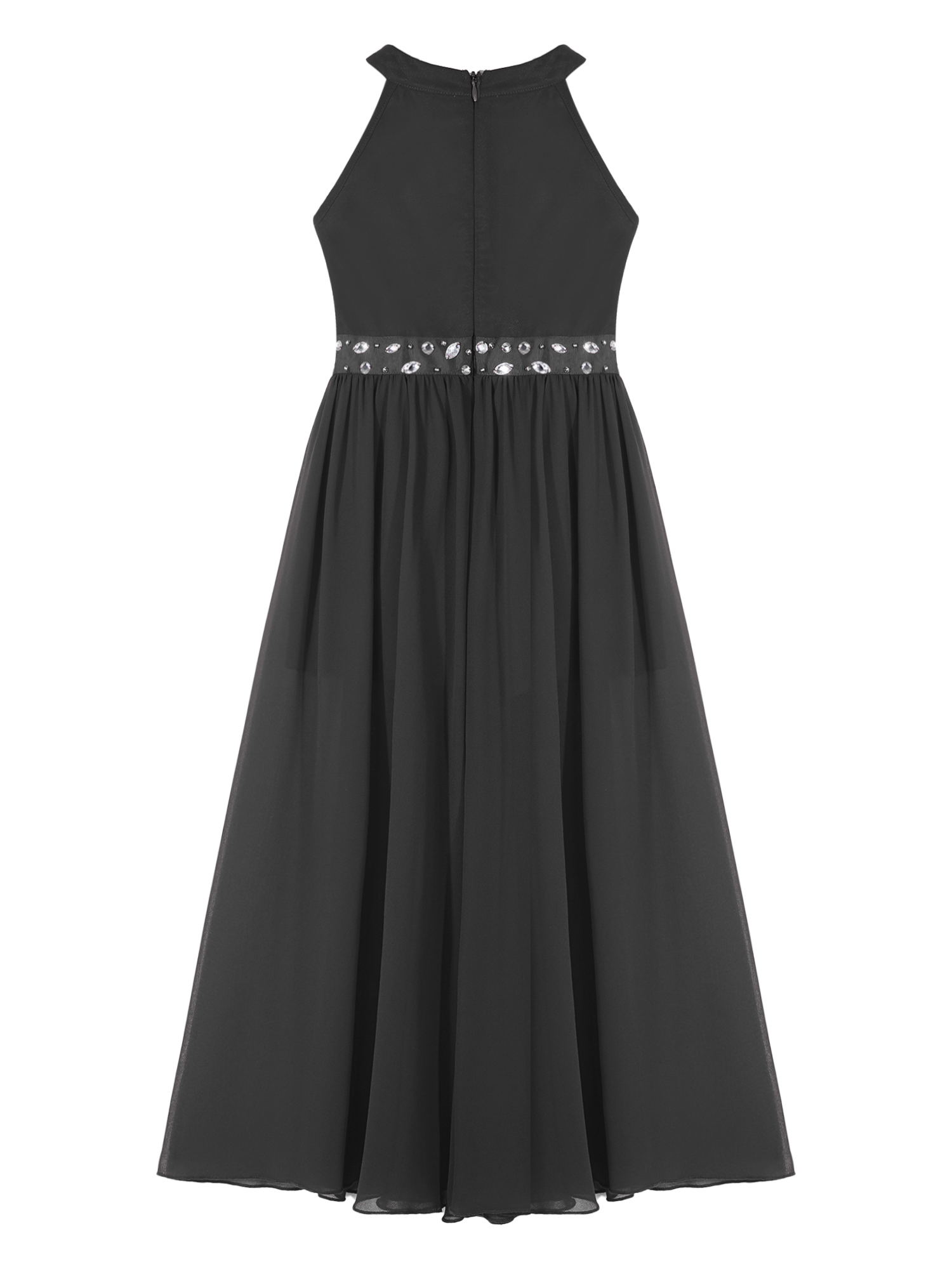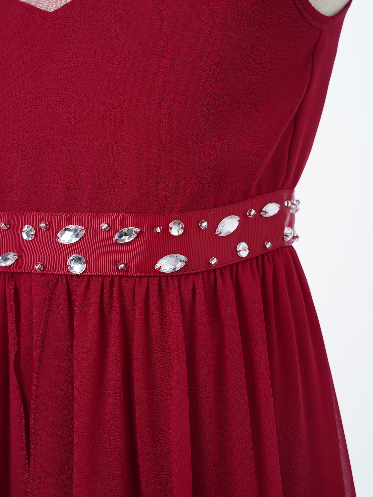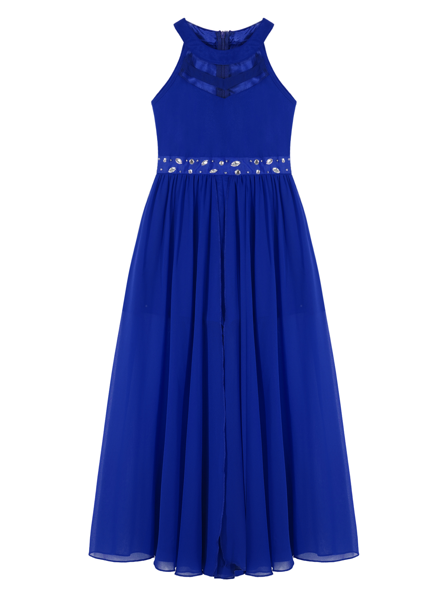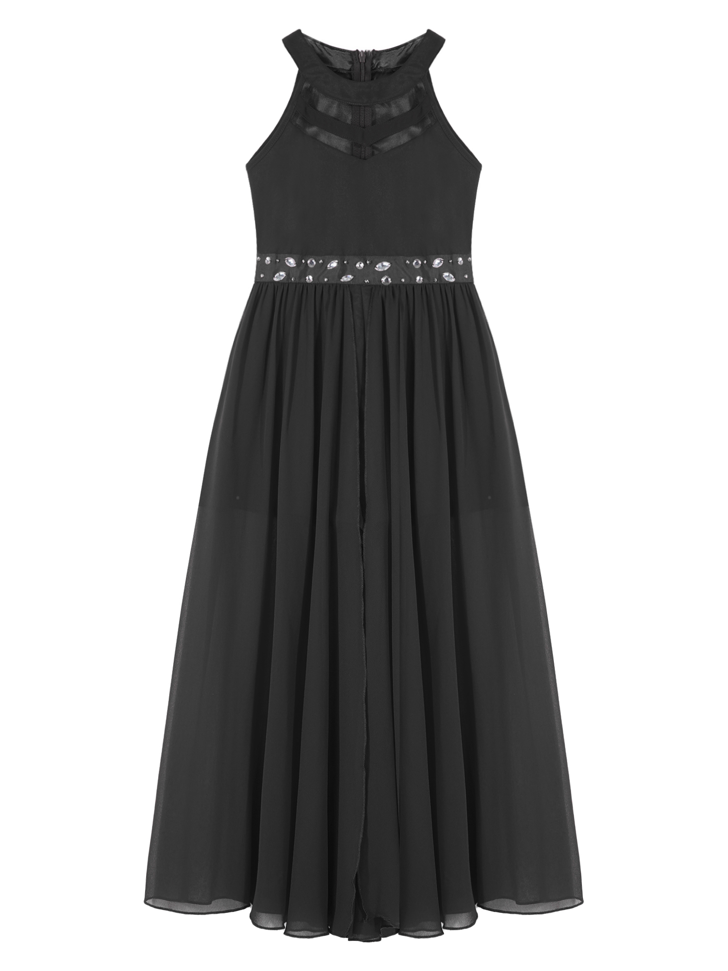 Без рукавов, круглый вырез, вырез в полоску на груди, блестящее украшение из бисера вокруг талии, застежка-молния сзади.
