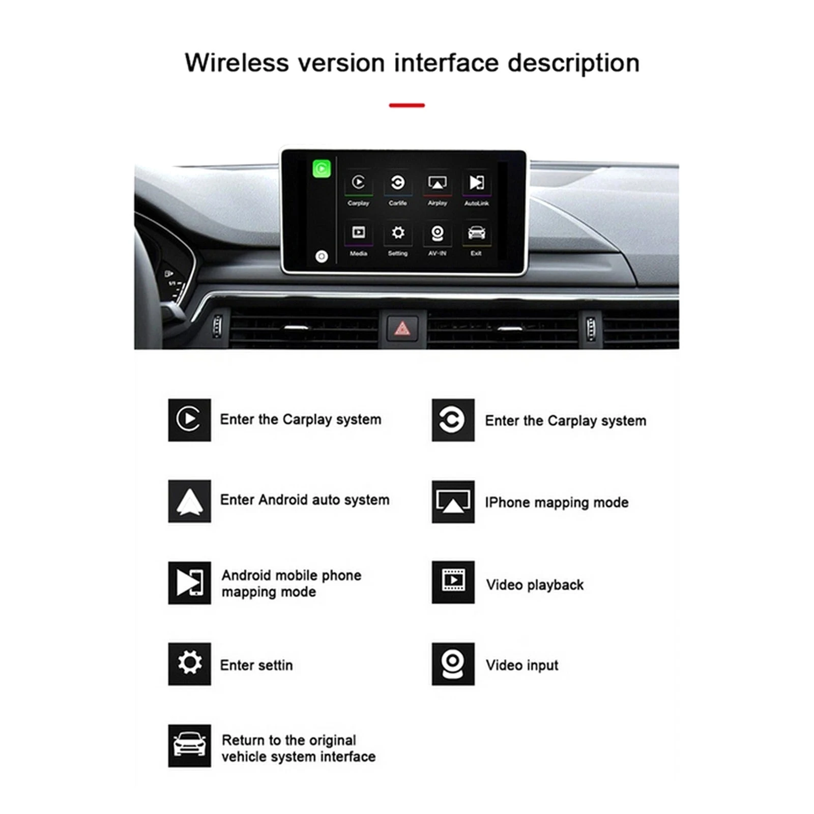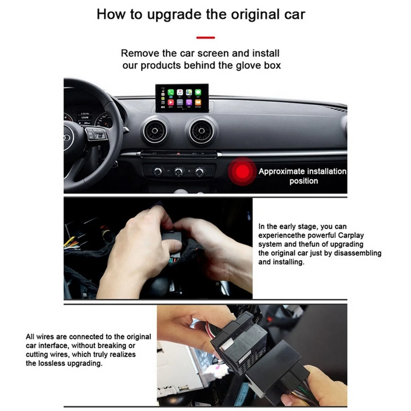 1. При покупке, пожалуйста, подтвердите, что ваша модель, дисплей в автомобиле и панель управления соответствуют тем, что на веб-сайте. Этот беспроводной набор для преобразования Carplay Подходит для Audi A1 A3 A4 A5 A6 A7 A8 Q2 Q3 Q5 Q7 и т. д. 2010-2019, если вы не уверены, пожалуйста, сначала обратитесь к нам за помощью.