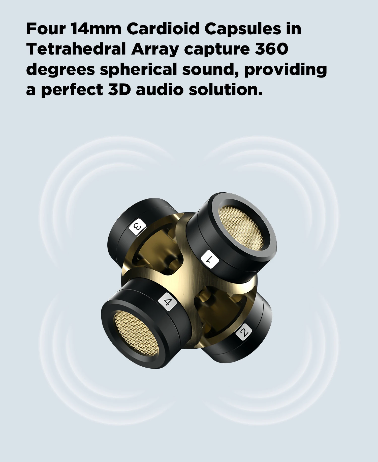 Четыре 14 мм кардиоидные капсулы в тетрагранном массиве захватывают Сферический Звук 360 градусов, обеспечивая идеальное 3D аудио решение. Этот уникальный дизайн позволяет запечатлеть окружающий звук с одной точки. Полностью Сферический звук ambisonics может идеально соответствовать вашему видео VR/сферическому содержанию 360.