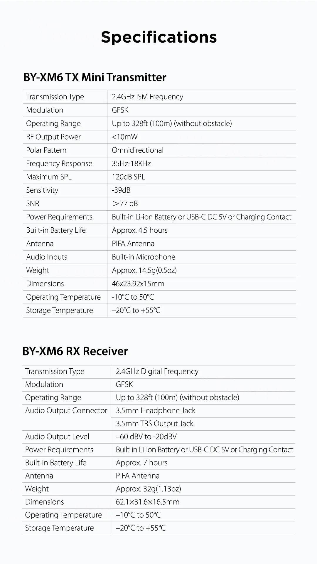 BY-XM6 Mini идеально подходит для работы с DSLR, беззеркальными, миксером, современными компьютерами, смартфонами, планшетами и т. д. Кроме того, передатчик и приемник оснащены встроенной перезаряжаемой литий-ионной батареей, что делает его стоящим вариантом для создателей контента, чтобы рассмотреть, если они постоянно снимают на открытом воздухе.