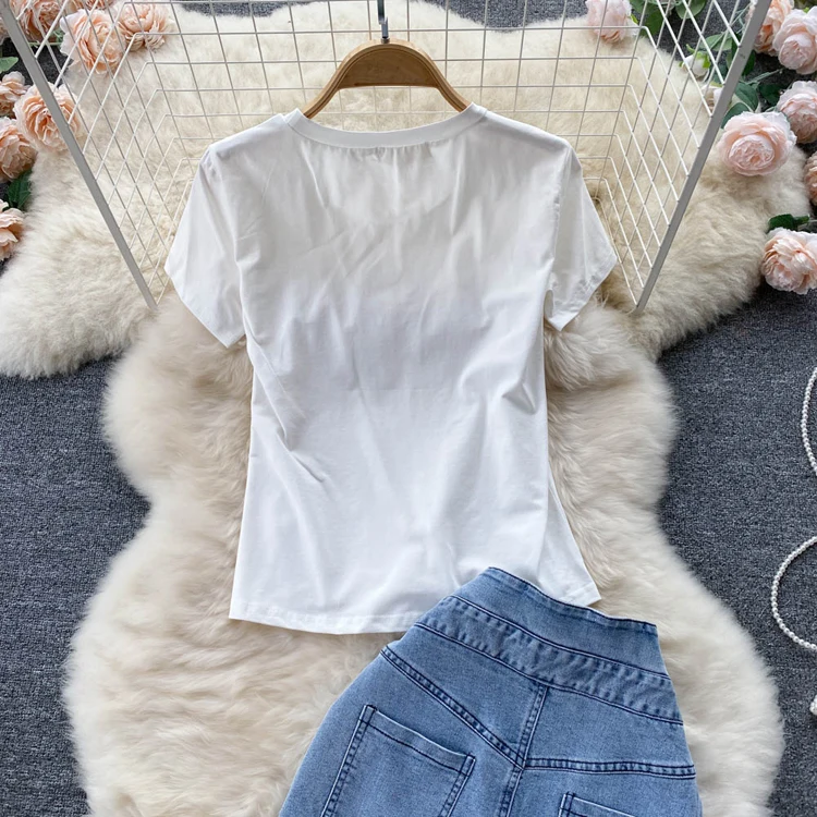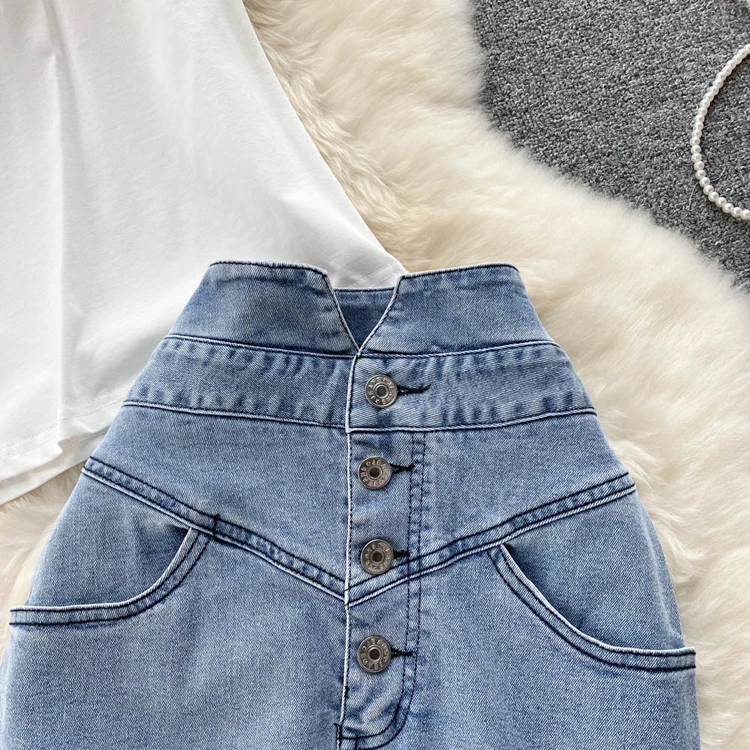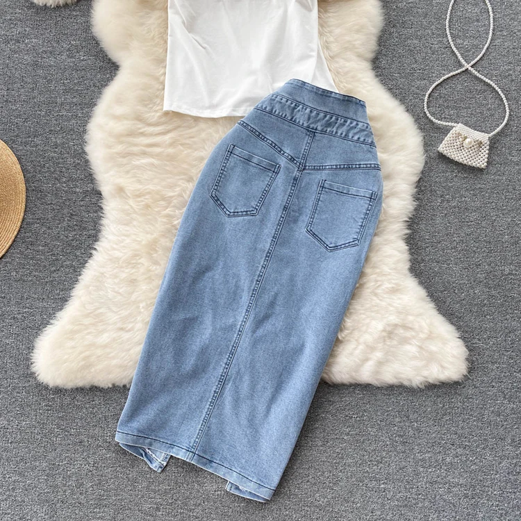 Летний комплект из двух предметов, Женская Повседневная футболка с круглым вырезом и джинсовая юбка с вырезами, модный офисный комплект, элегантный облегающий комплект Ropa Femenina