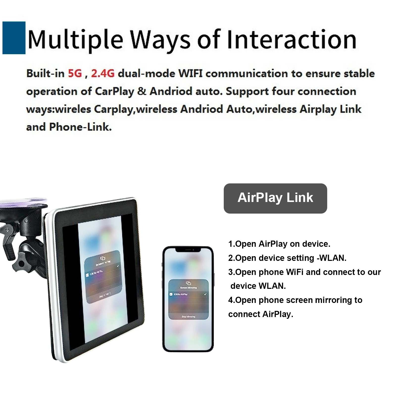 1. Несколько способов взаимодействия: Встроенный 5G, 2,4G Двухрежимная Wi-Fi связь для обеспечения стабильной работы автомобиля CarPlay & Andriod. Поддержка четырех способов подключения: Wireles Carplay,Wireless Andriod Auto,Wireless Airplay Link и Phone Link.