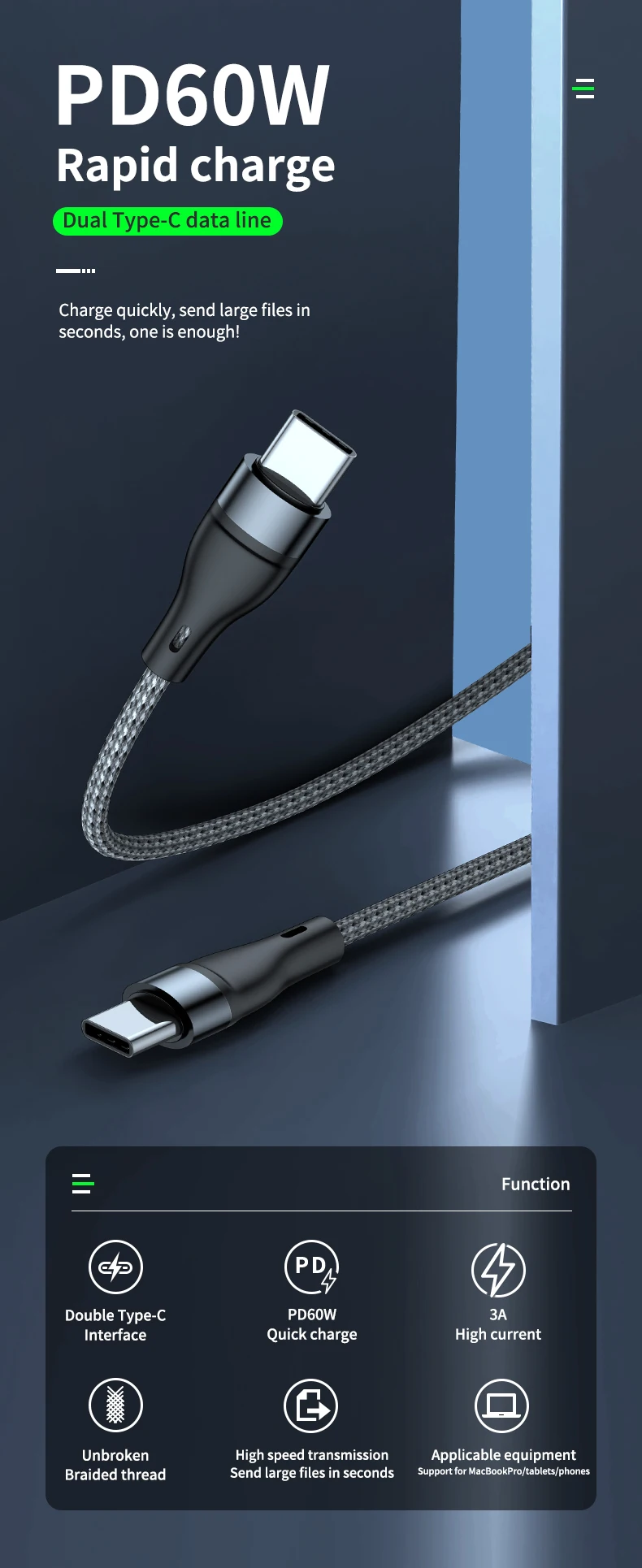 1. PD Быстрый зарядный кабель безопасен и не вредит мобильному телефону, PD60W быстрая зарядка, двойной разъем, зарядка и передача два в одном;