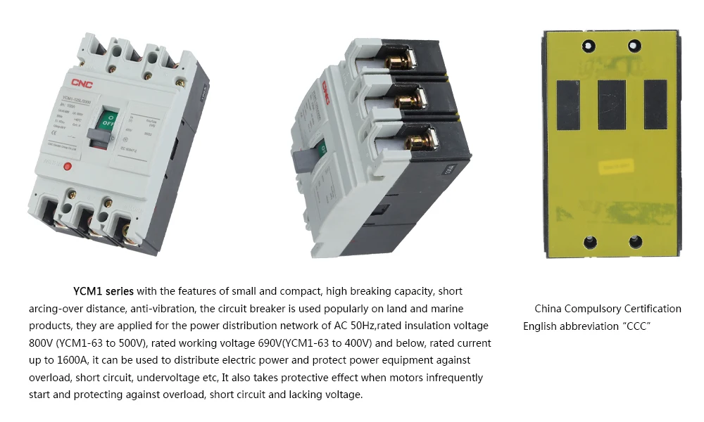 YCM1 series moulded case circuit breaker(herein after called circuit breaker) adopts international advanced design and manufactural technology, it can be divided into L-type (standard type), M-type (higher type)according to the rated ultimate short circuit breaking capacity (Icu). With the features of small and compact, high breaking capacity, short arcing-over distance, anti-vibration, the circuit breaker is used popularly on land and marine products, they are applied for the power distribution network of AC 50Hz,rated insulation voltage 800V (YCM1-63 to 500V), rated working voltage 690V(YCM1-63 to 400V) and below, rated current up to 1600A, it can be used to distribute electric power and protect power equipment against overload, short circuit, undervoltage etc, It also takes protective effect when motors infrequently start and protecting against overload, short circuit and lacking voltage. In the series, frame ranging from 63-630A three-pole product also comes with a transparent cover, it is convenient for customer to observe the product operation.
