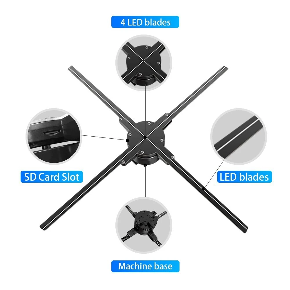 Четкий и большой дисплей: 1022 шт ярких светодиодов, разрешение 1024*1024, эффект 3D голограммы. Диаметр дисплея 50 см . Угол обзора 160 °, 620 об/мин.Высокое качество :Изготовлен из высококачественных материалов, ориентируясь на каждую деталь, чтобы достичь лучшего качества. Без щёточный двигатель из чистой меди, надежный и долговечный, более длительный срок службы. 4 съемных лезвия, чтобы получить 3D визуальные эффекты. .Поддержка WiFi подключения: Этот голограммный проектор может подключаться к телефону через Wi-Fi соединение. Бесплатная загрузка приложения из Apple Store и (для) Google Play, поиск-3D Displayer. Язык приложения: английский, китайский. Формат содержимого поддерживает mp4, avi, rmvb, mkv, gif, jpg, png (черный фон лучше).Пульт дистанционного управления и кронштейн. Также с настенным монтажным кронштейном и винтами для установки. Защитный кожух-экран. Лучше всего отображать в выставочных залах, выставках, торговых центрах, аэропортах, больших мероприятиях для привлечения внимания других людей, распространения и обмена рекламным контентом продукта. Характеристики. Материал: АБС + аппаратный материал Вилка евро. Входная мощность: AC1 00-240V 50/60HzВыход Мощность: 24V 3000mAНоминальная мощность: 50 Вт Диаметр дисплея: около 50 см/27,6 дюйма Лезвия: 4 Количество СВЕТОДИОДНЫЙ: 1022 шт.Разрешение: 1024*1024 пикселей Угол обзора: 160 °Срок службы ламп: 100000 часов Яркость: 1600 Скорость вращения: 620 об/мин Поддержка: tf-карта + WIFIПоддержка tf-карты: до 32 Гб Поддерживаемые форматы: mp4, avi, rmvb, mkv, gif, jpg, png Версия приложения: совместимость с iOS, Android, ПК Операционная система: Win7, Win8, Win10 Функция приложения: Беспроводная Удаленная передача данных, регулировка яркости, циклическая воспроизведение, приложение выберите следующую и предыдущую страницу, преобразование формата файлов, сделайте видео или изображение. Язык приложения: английский, китайский. Не прикасайтесь к рекламной машине, когда изделие вращается. Руководство пользователя (на английском языке)
