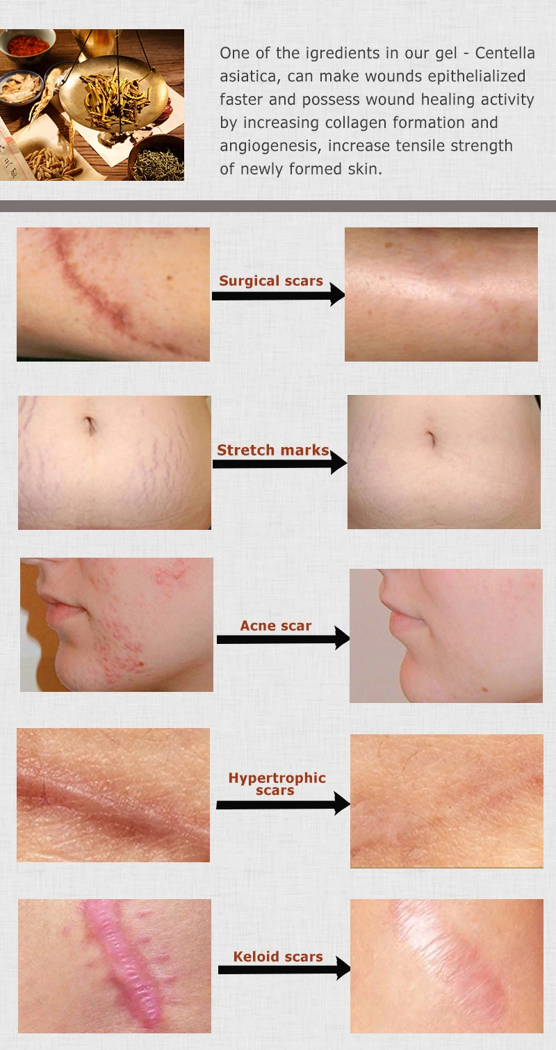 Успокаивающий аромат с уникальной растительной формулой помогает смягчить, сгладить и уменьшить внешний вид акне и шрамов, особенно для шрамов в комочках, неровности или обесцвечивания. Защита от аллергии, безопасна и эффективна для уплотнения шрамов сходства. Мягкая и гладкая поврежденная кожа за короткое время.