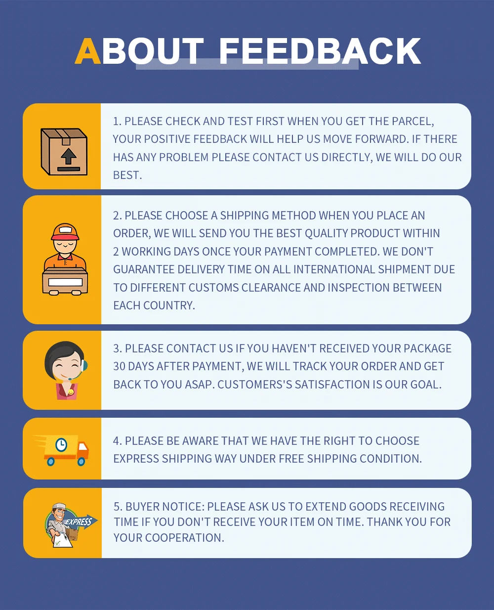 5. Примечание покупателя: Пожалуйста, попросите нас продлить время получения товара, если вы не получили ваш товар вовремя. Спасибо за сотрудничество.