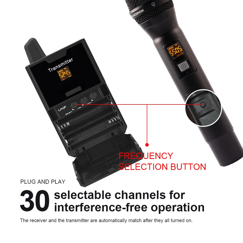Стабильные сигналы в диапазоне частот UHF, с 30 выбираемыми каналами в диапазоне частот 520-580 МГц, для работы без помех, рабочий диапазон до 50 м (165ft).