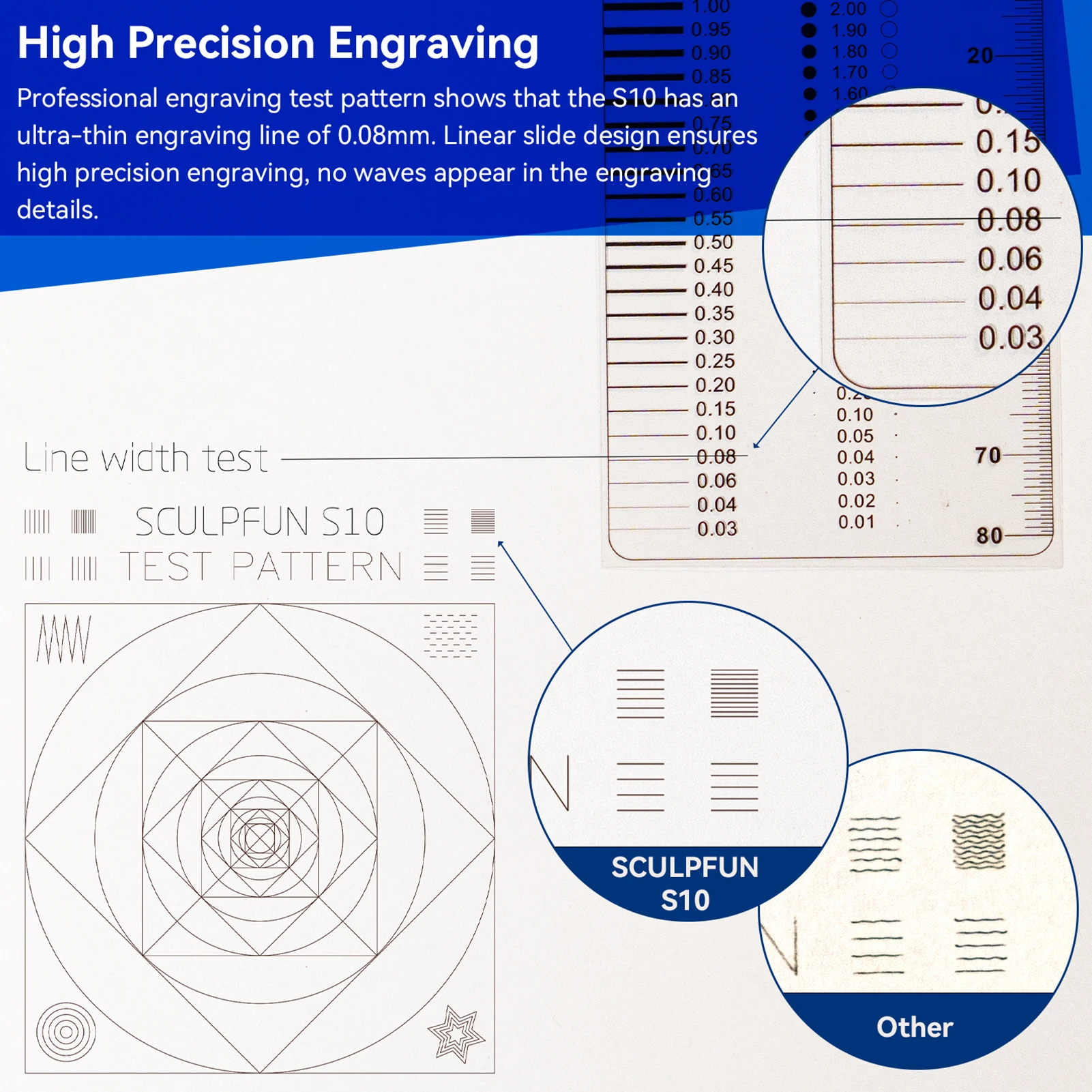 Промышленная точность резки:S10 принимает промышленные высокоточные линейные рельсы X-axis, что делает его получить точность гравировки промышленного класса. При сравнении небольших гравировальных деталей, S10 не имеет волновых линий, которые появляются другие обычные гравировальные машины.