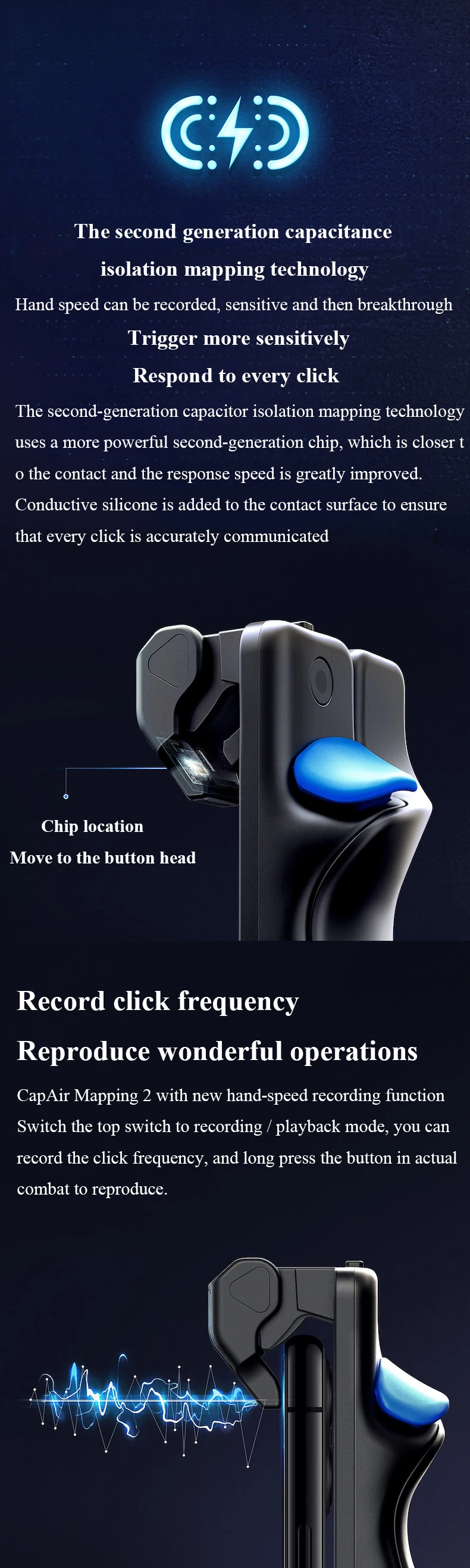 Второе поколение постоянной ёмкости, универсальный конденсатор изоляции технология отображения для ускорения ударов руки можно записать, чувствительный, а затем прорыв триггер более чутко реагируют на каждым нажатием кнопки второго поколения конденсатор с алюминиевой крышкой изоляции технология отображения использует более мощный второго поколения чип, которая находится ближе к контакту и скорость отклика значительно улучшается. Проводная силиконовая добавляется к контактной поверхности для того, чтобы гарантировать, что вы получите нажмите точно связь о том, что вы хотите, чип расположение перейти к головка кнопки записи нажмите частоты воспроизвести замечательный операций CapAir карт 2 С новая ручная скорость записи переключение между функциями верхний переключатель для записи/режим воспроизведения, вы можете записать нажмите частоты, а также для включения нажмите и удерживайте кнопку в реальных боевых действий, чтобы воспроизвести