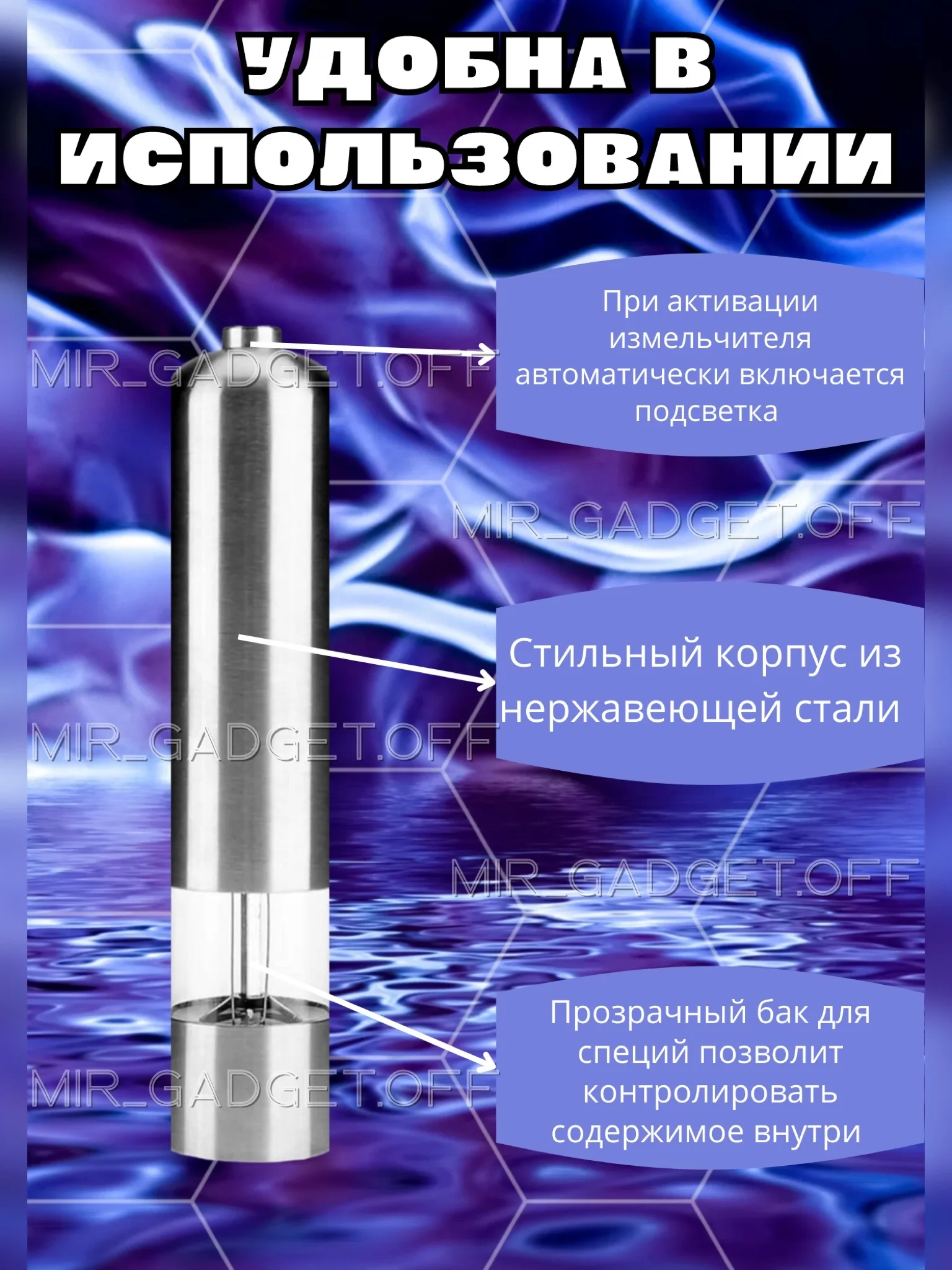 Мельница для специй на батарейках это настоящий тренд. Мельница электрическая, идеально измельчит любую специю до нужного помола. Перцемолка с подсветкой станет вашим помощником в приготовлении пищи. Перцемолка элетрическая, электромельница имеет 3 уровня помола: мелкий, средний, купный. Перчница электрическая станет незаменимой вещью на вашей кухне и любимым предметом среди вашей бытовой техники. Электро мельница на батарейках позволит быстро и эффектно добавить соль, перец и другие приправы в любимое блюдо. Мельница для перца, для соли отлично и стильно подойдет для современной кухни. Сьемная крышка не даст мелким частицам рассыпаться после использования! Лучший подарок на день рождения парню, любимой, девушке, сестре, подруге, коллеге, брату, другу, любимому мужчине. Дизайн набора электронных перцемолок подойдет и для ресторана, и для домашней кухни. Корпус эргономичной формы выполнен из нержавеющей стали.