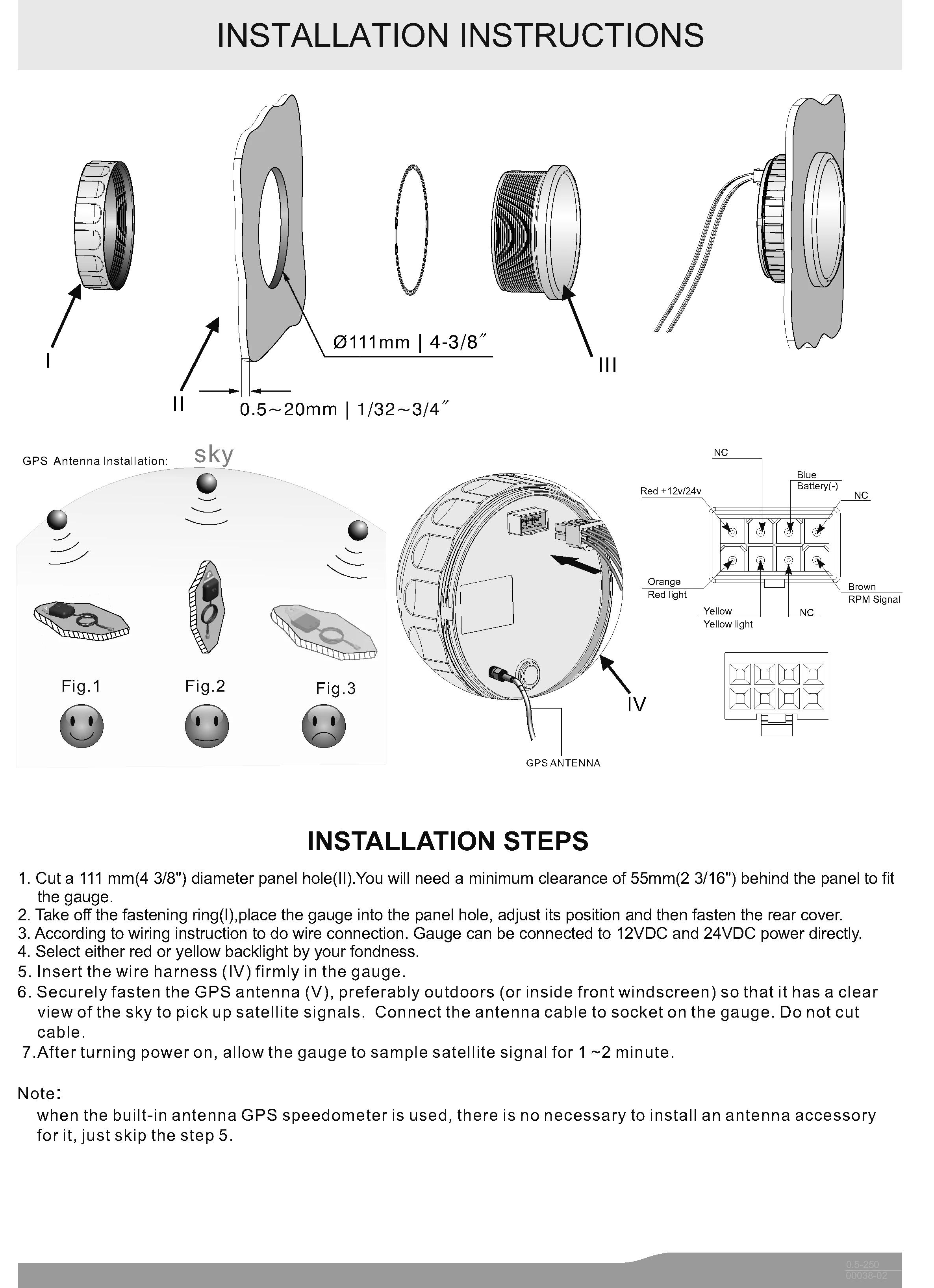 Name: GPS SpeedometerMaterials: stainless steel+nickel-plated plasticOperating Voltage: 12V/24VConnection: Red-Battery(+9-32VDC) Blue-Battery(-) Orange/Yellow-Backlight(+9-32VDC)Indicating Range: 0-60MPHInput Signal: GPS signal, with GPS antennaProtection Class: IP67, can work underwater 1m position
