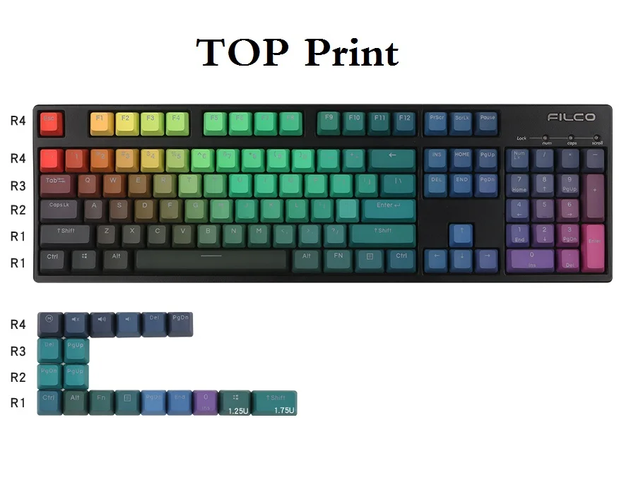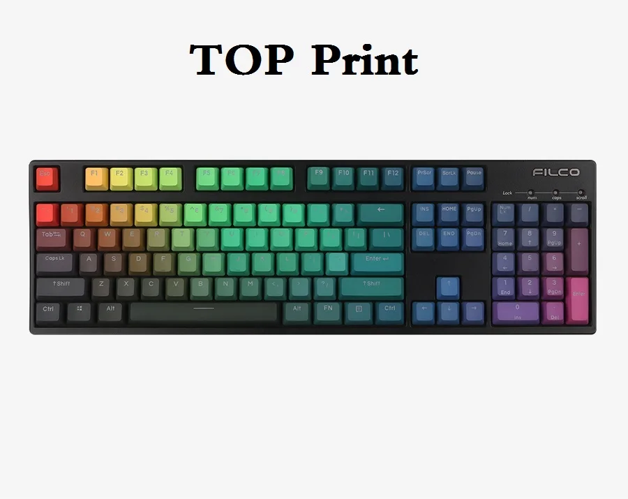 1. Боковые/верхние печати двух стилей keycaps могут быть выбраны. Keycaps принимает светильник-передающий дизайн, который является более красочным и красивым под клавиатурой задний светильник.