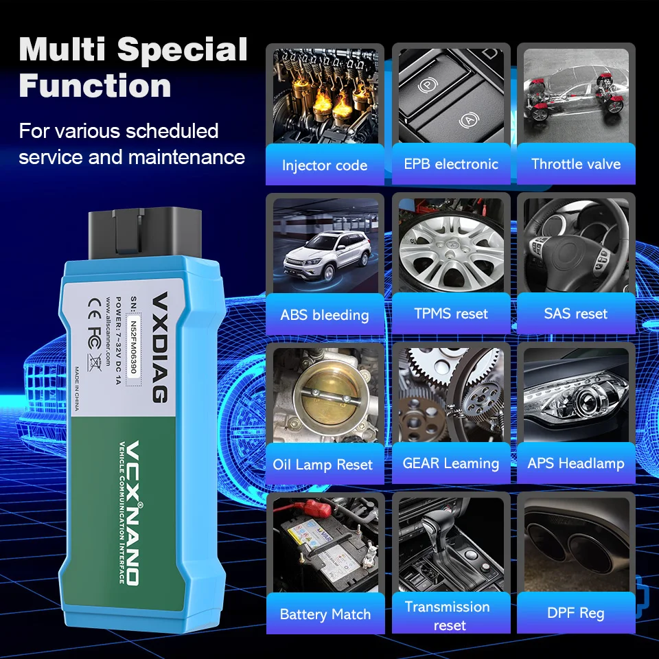 Для различных плановых услуг и обслуживания включают в себя сброс технического обслуживания светильник, обучение дроссельной заслонки, обучение углу рулевого управления, сброс тормозных колодок, сброс давления в шинах, выхлоп ABS, согласование батарей, обучение информации о передаче, Кодирование инжектора, DPF регенерация, светильник с головкой, обучающая коробка передач, подвеска, инициализация солнечной крыши, регулировка A/F, Запуск электронного насоса, режим транспортировки, модификация шин, калибровка дверей и окон, сброс мочевины, сброс NOx, настройка запуска, Настройка языка, калибровка сидений, отказ от экранирования и т. д.