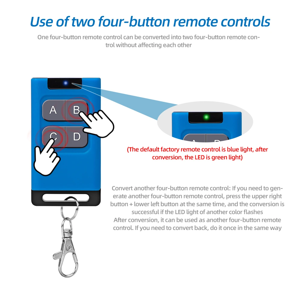 Шаг 2: Скопируйте код: Нажмите 2 кнопки оригинала и клона, пульт дистанционного управления должен быть расположен рядом, нажмите 2 кнопки одновременно, отпустите, когда светодиодный индикатор продолжает мигать. (Совет: Нажмите кнопку клон на пульте дистанционного управления клон, если светодиодный индикатор всегда включен, это означает, что код клона успешен)
