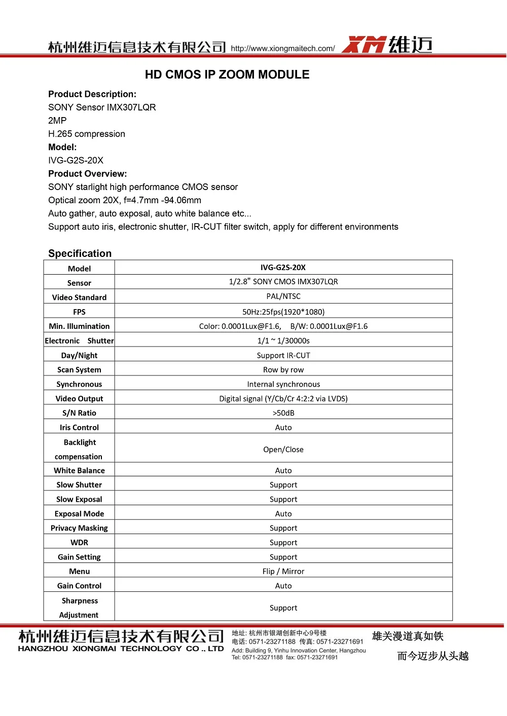 * 4,7 ~ 94,06 мм моторизованный зум-объектив, с IRC фильтром. Управление зумом и фокусом по (CMS или IE explorer).