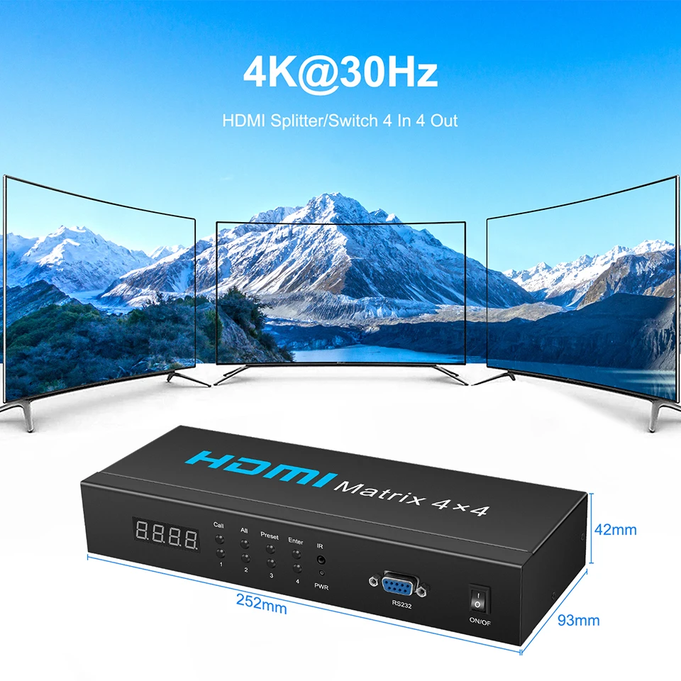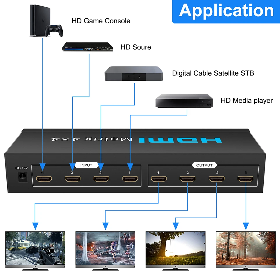 Эта Матрица HDMI 4x4 может подключать 4 источника сигнала HDMI к 4 разъемам дисплея HDMI. Он позволяет переключать или разбивать 4 устройства HDMI на 4 совместимых с HDMI мониторов или проекторов. Идеально подходит для выставочного зала, домашнего кинотеатра, образования и обучения; Конференц-зала и двора.