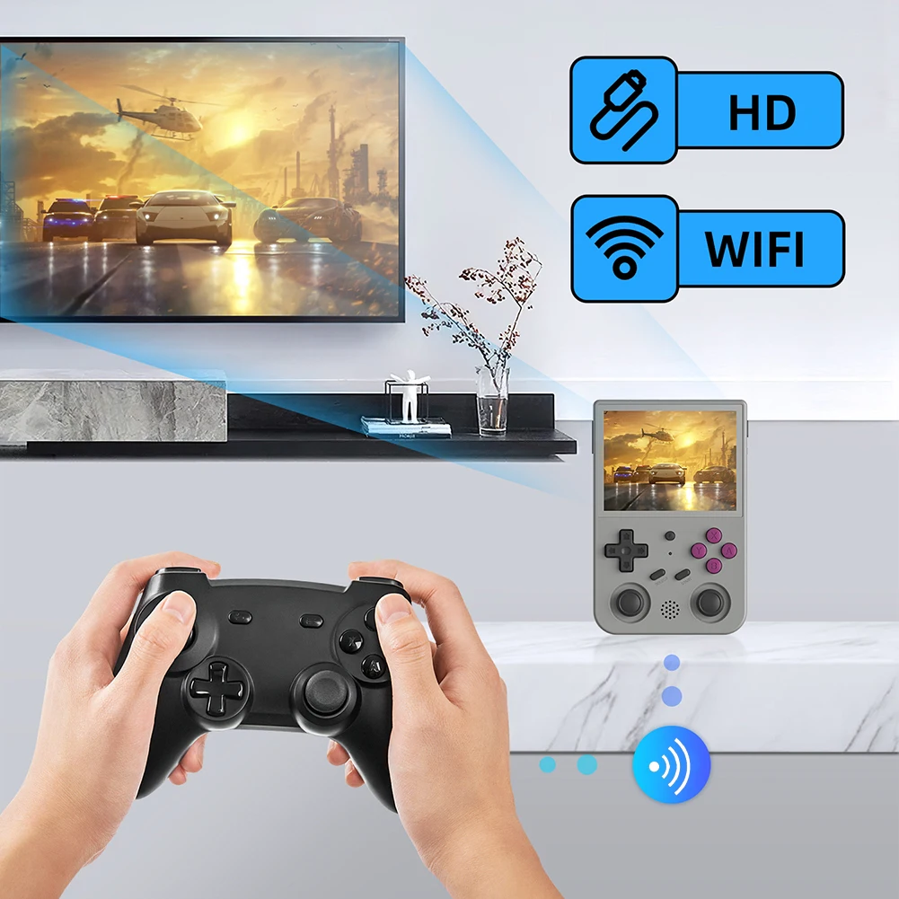 5. Игровая консоль и Проводная Ручка:Легкий и компактный, легко помещается в карман, вы можете играть в любое время и в любом месте. Это не только игровая консоль, но и Проводная ручка, которая соединена с четырехъядерным кабелем передачи данных и ручкой Аватара. Hdmi-совместимая Беспроводная или беспроводная проекция, вы можете выбрать.Спецификация:Модель: RG353VS/RG353V (опционально)
