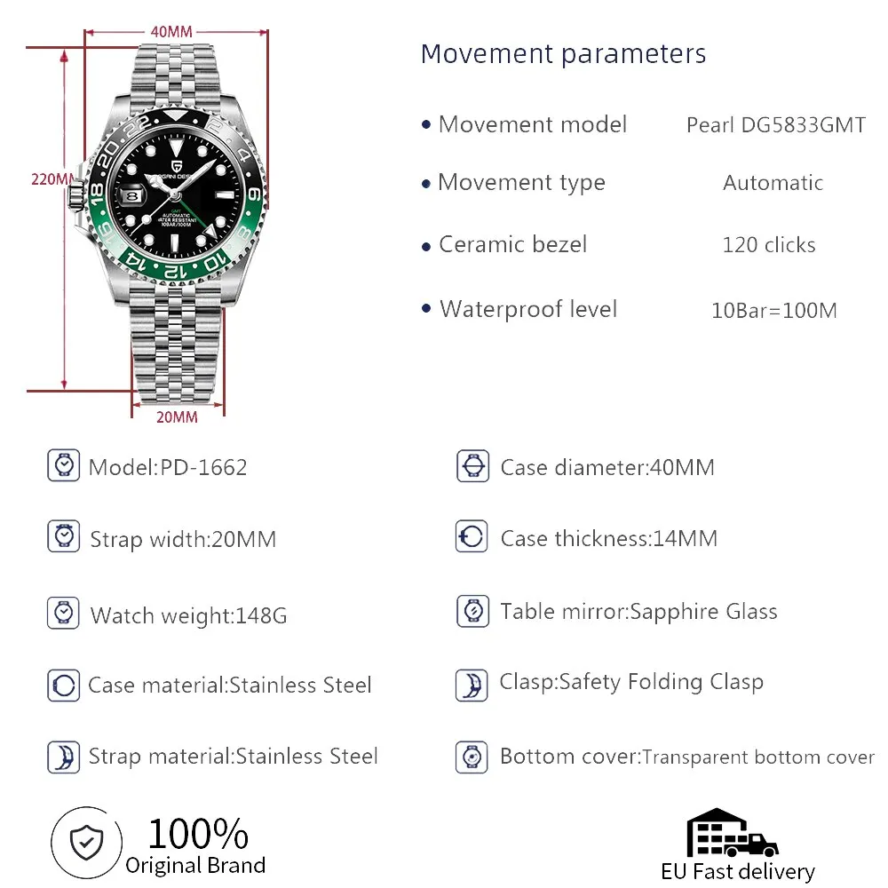 • Окно Циферблат Сапфировое Стекло :Окно циферблата из сапфирового стекла обеспечивает устойчивость к царапинам и долговечность, гарантируя, что циферблат остается четким и легко читается.