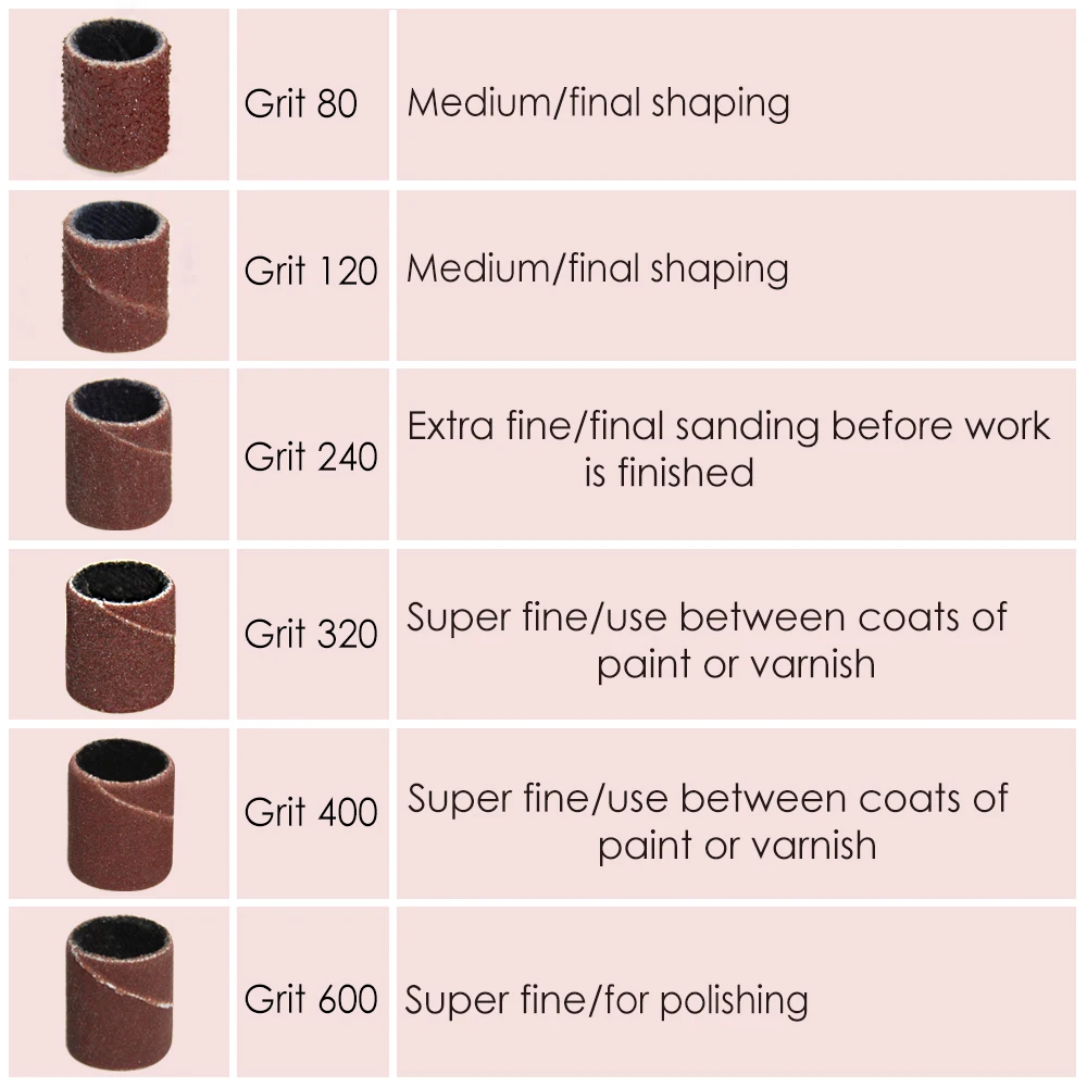 • Зернистая 80/120 подходит для среднего/конечного формирования • Зернистость 240 подходит для дополнительной тонкой или окончательной шлифовки перед завершением работы. • Зернистость 320/400 подходит для очень тонкого или использования между слоями краски или лака • Зернистость 600 подходит для супер тонкой полировки