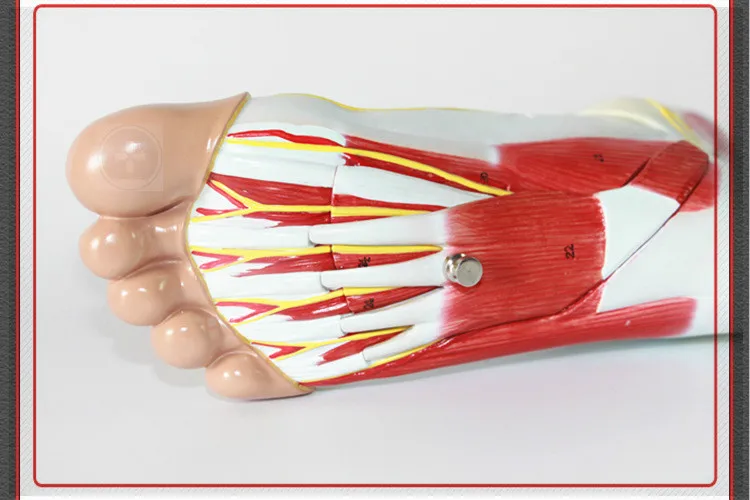 Эта модель 1:1 размера ноги, может быть разделена на 3Части. Внутренняя и внешняя структура стопы человека подробно демонстрируется. Основные мышцы, сухожилия, кровеносные сосуды и распределение нервов стопы были точно воспроизведены, с количеством знаков и с текстовым описанием.