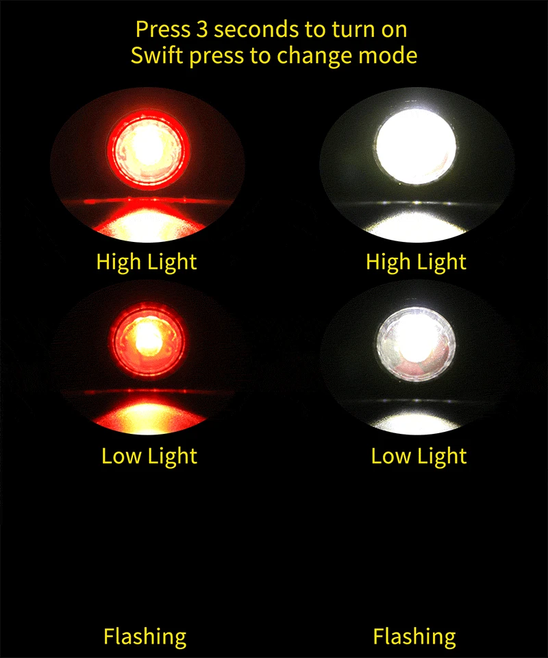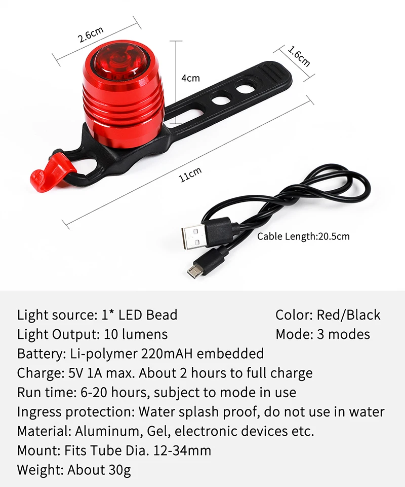 Светильник источник света: 1 * Светодиодный шарик Цвет: красный/черный светильник Выход: 10 люменов Режим: 3 режима батареи: встроенный литий-полимерный аккумулятор 220 мАч Зарядка: 5 в 1 а макс. около 2 часов для полной зарядки Время работы: 6-20 часов, при условии использования режима Защита: Защита от брызг воды, не использовать в воде Материал: алюминий, гель, электронные устройства и т. Д. Крепление: подходит для диаметра трубки. 12-34 мм Вес: около 30 г