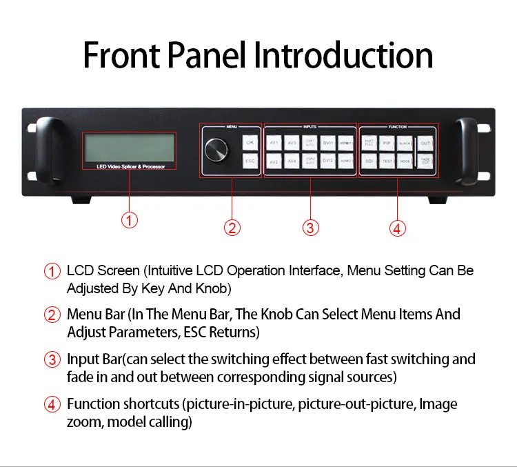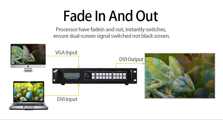 Бесшовное Переключение-светодиодный видеопроцессор также может плавно переключаться между любым каналом Переключение, время регулируется от 0 до 5,0 секунд. С эффектом выцветания, Переключайте вход Канал, так что экран может быть переключен плавно на второй экран. Использование быстрого переключения, Переключая входные каналы, вы можете мгновенно Переключить видеовыход. Полновыходное разрешение-светодиодный видеопроцессор предназначен для пользователей с удобным выходным разрешением, самый широкий Достигает 3840 точек, что является самым высоким в 1920 точек, для различных точечных матричных дисплеев. До 20 видов продукции Разрешение для пользователей на выбор, и может быть настроен на точечный выход. И у него есть пользовательское разрешение.
