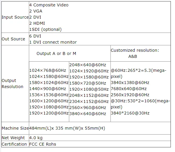 > Бесшовное переключение видео настенный контроллер > 11 каналов цифро-аналоговый видео вход > Один ключ черный экран и замораживание > Максимальное выходное разрешение: 7680*640 @ 60Hz 4608*1152 @ 60Hz 3840*2160 @ 60Hz > 2-х канальный с соединением внакрой, 1 канал монитора > 5,3 миллионов пикселей настраиваемое разрешение > Двойной вид бродит по всем каналам > Предустановленное сохранение и отзыв > Поддержка 4 карты отправки