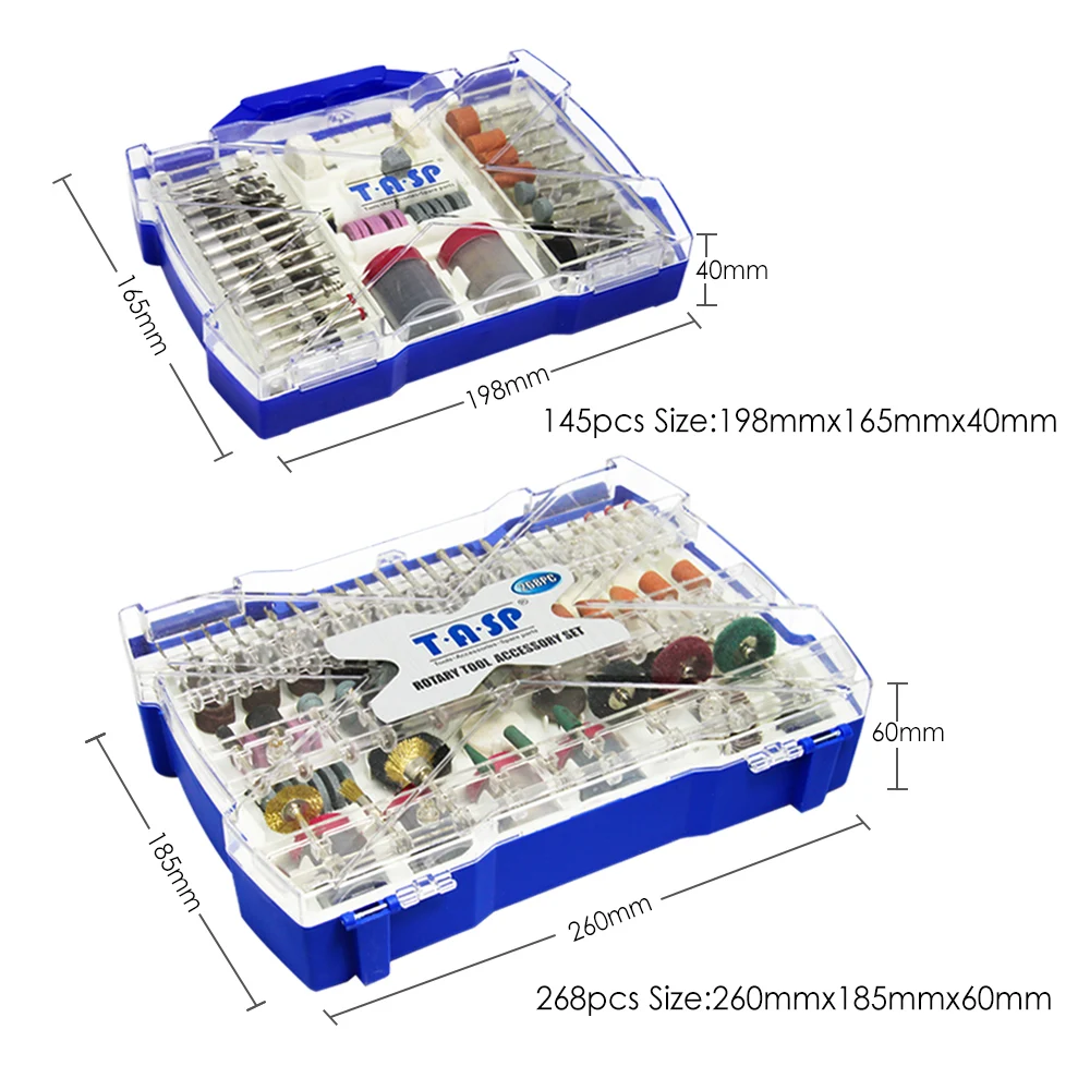 -Набор TASP 268 шт/145 шт идеально подходит для широкого спектра применений, таких как: гравировка, резьба, маршрутизация, резка, шлифовка, полировка и многое другое. -Он содержит различные высококачественные аксессуары, которые позволяют пользователю выполнять широкий спектр приложений. -Диаметр хвостовика Размеры: 3,2 мм (1/8 "). -Может использоваться на электрических вращающихся инструментах.