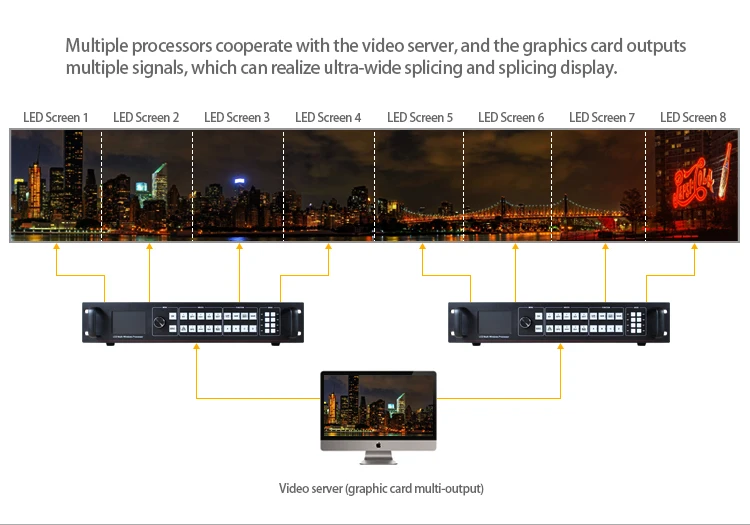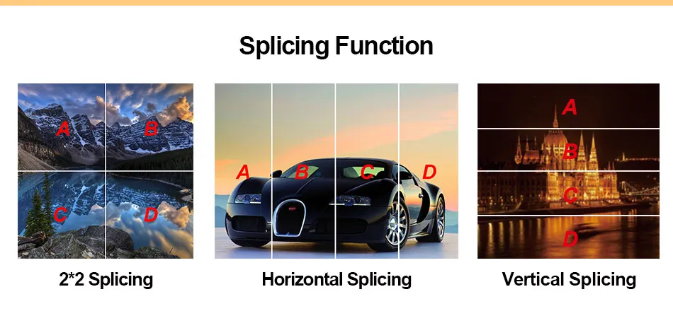 Продукт поддерживает интеллектуальное Сращивание. Мастер установки прост в эксплуатации, пользователи могут быстро завершить работу. Продукт может вместить широкий спектр входных источников, до двух HDMI-4K, два DP-4K и поддержка ввода SDI. 4 независимых процессора изображений, 4 канала полностью настраиваемых входов, выбор 4 входов на светодиодный экран.