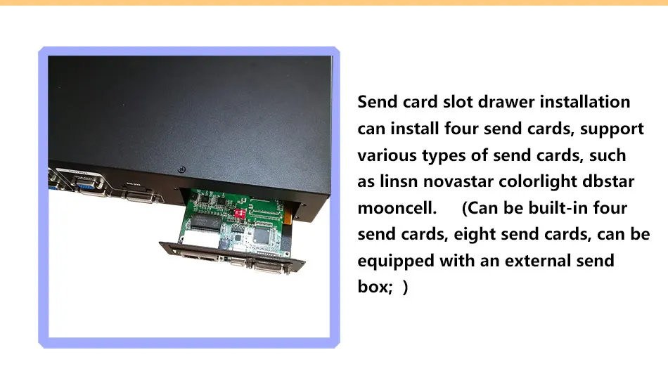 Черно-замораживание Функция Поддержка ввода SDI или USB (опционально) Синхронизация аудио декодирования Выход Поддержка WIFI, управление RS232 Поддержка 8 стандартных карт отправки Можно установить 4 стандартные карты отправки