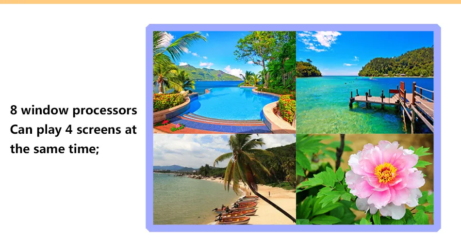 Это высококачественный 4-канальный мультиграфический комбинированный видеопроцессор 4K x 2K @ 60Hz, он может одновременно вводить 4K x 2K видео, и любое 4K x 2K видео может быть произвольно масштабировано и роуминг. Он может отвечать ультра-высоким требованиям к дисплею. Выход поддерживает индивидуальное решение, с переключением между дальним и канальный выход Поддержка 2,65 мегапикселя и четыре канала вывода до 10,6 Мпикс. Максимальное Сращивание составляет 4608 × 2304 или 9216 × 1152 или 4096 × 2304 или 1920 × 4800.