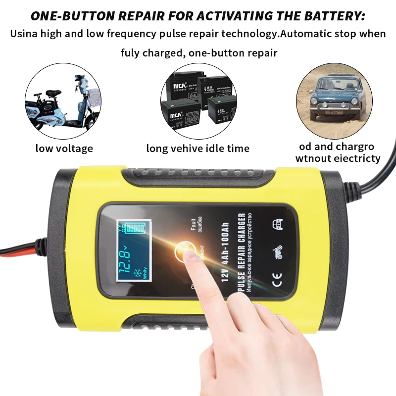 Интеллектуальная Зарядка, автоматическая остановка при полной зарядке, ремонт одной кнопкой, зарядка в зимнем и летнем режимеПодходит для внедорожников 12V2AH-90AHСухая батарея для воды, свинцово-кислотная батарея без обслуживания/(литиевая батарея)Управление микропроцессором (ЦП).